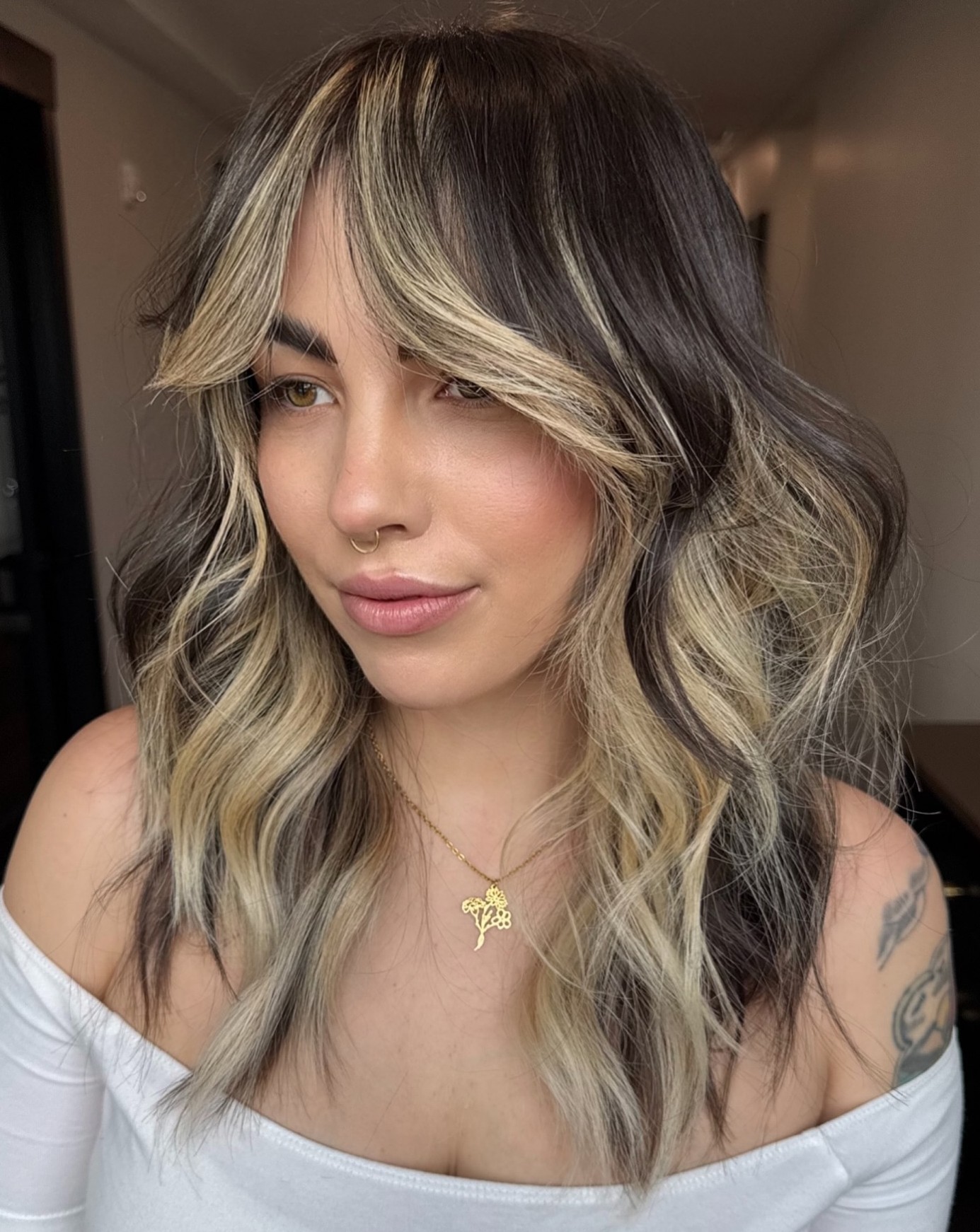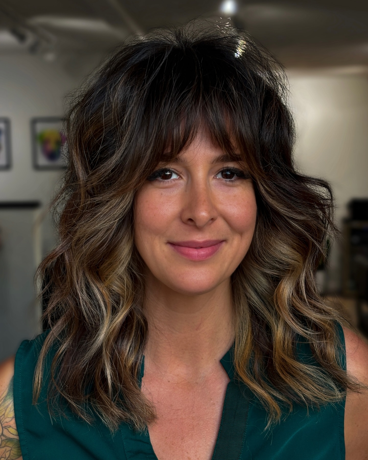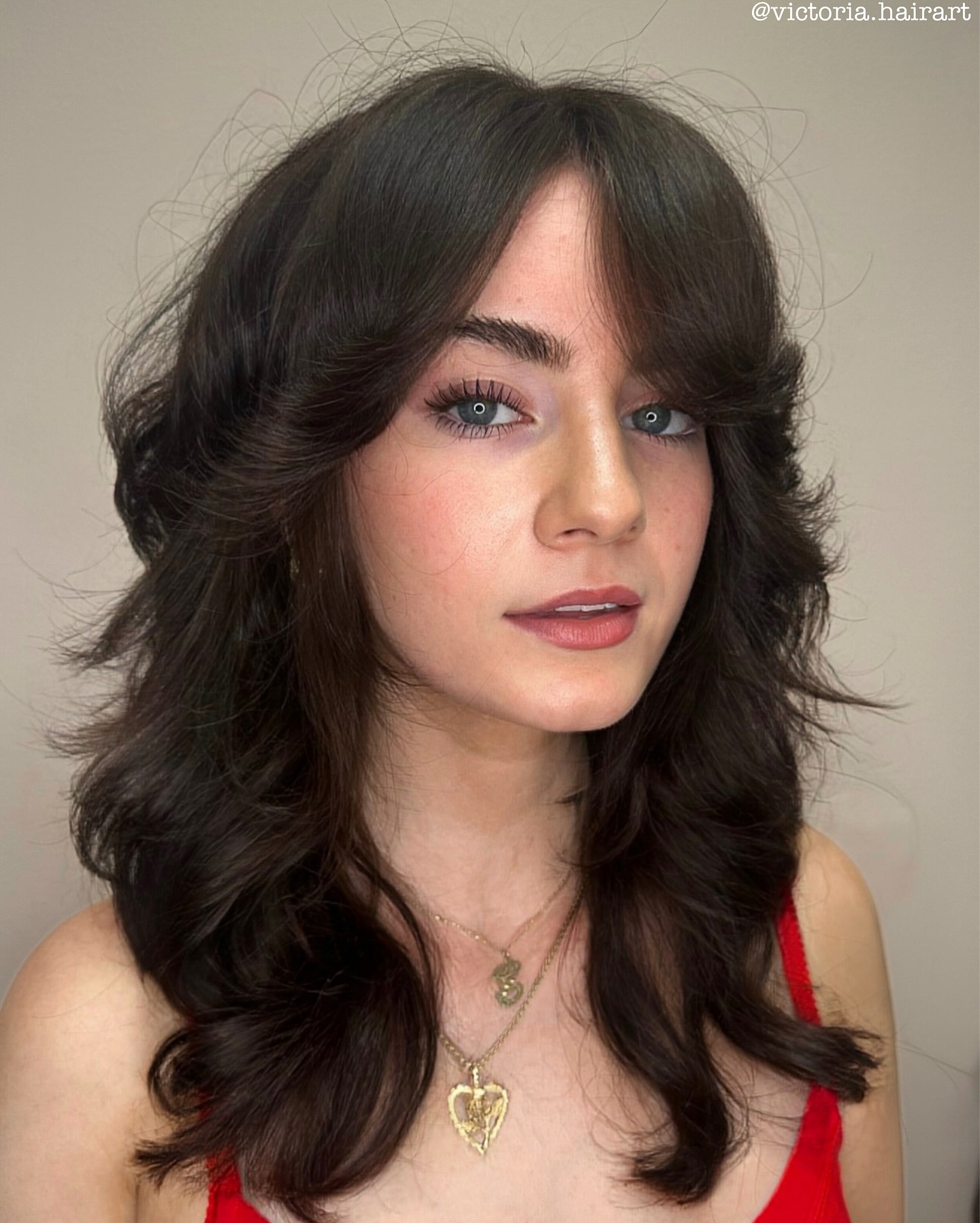 One way to style your hair is to create voluminous curls or waves for more texture and movement. But if that’s not your style and you love straight hair, then try a longer layered look with bangs. Ask your stylist to point cut these straight bangs at the ends instead of cutting them bluntly.