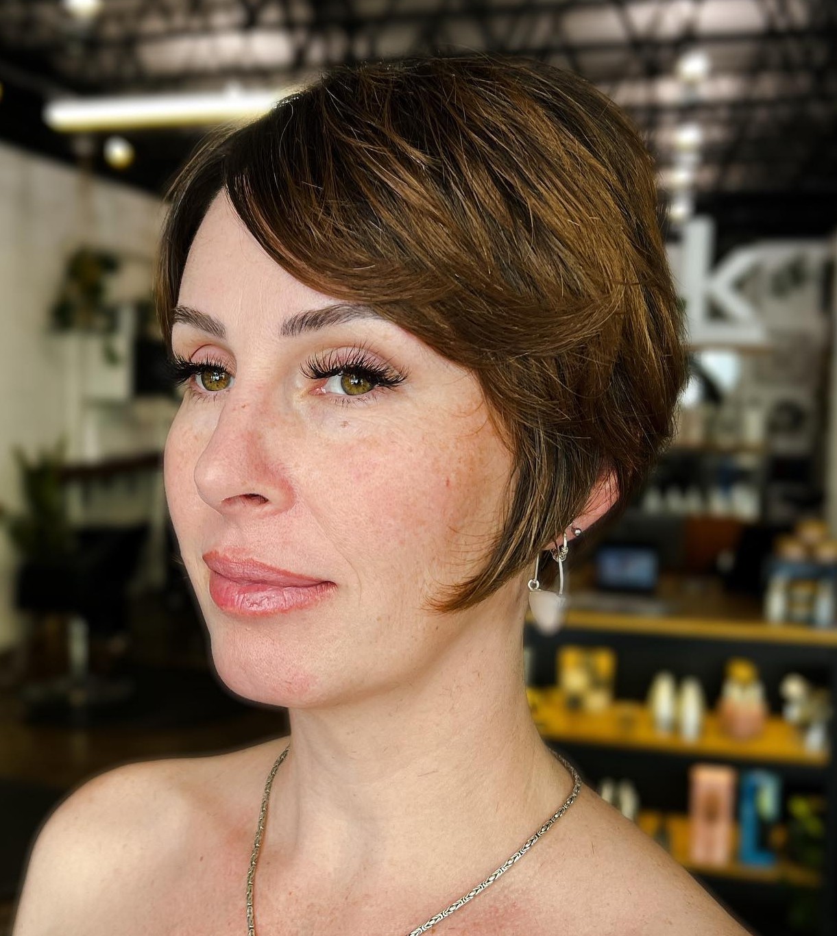 This pixie haircut is an ideal pick for those who don’t want to spend lots of time on daily hair styling. Since this ‘do has tons of texture, your face shape will look smaller in proportion.