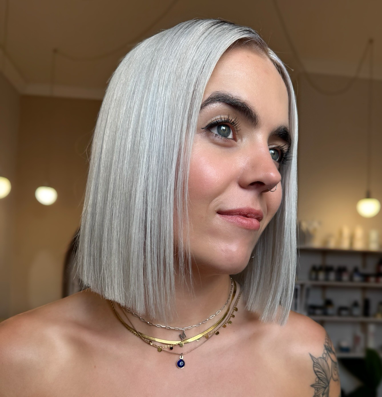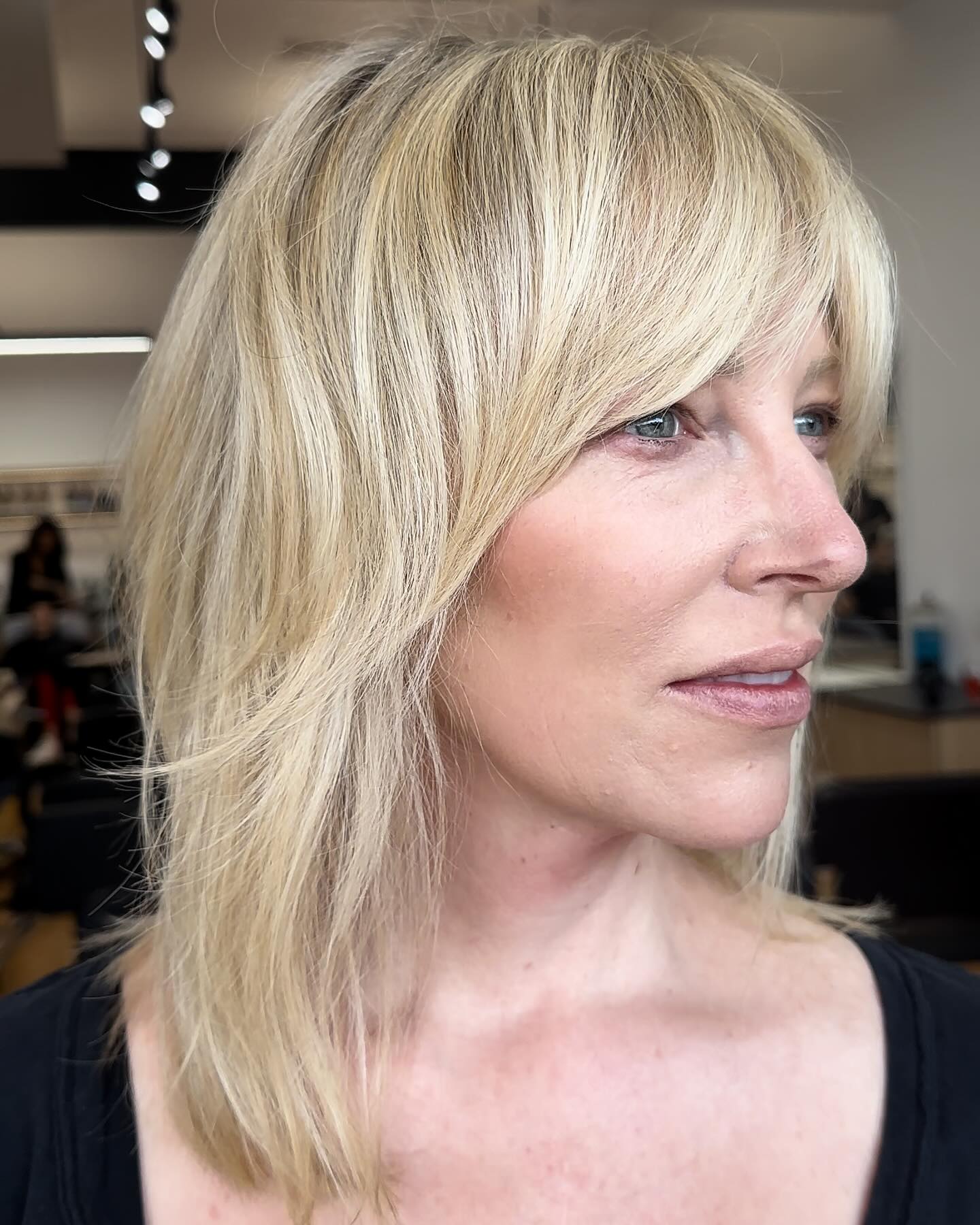 Bangs aren’t always necessary to flatter the face, as this example shows. A razored blonde lob can build body around your face and look effortlessly chic, especially if you ask your hairdresser to put in some extra feathered face-framing layers.
