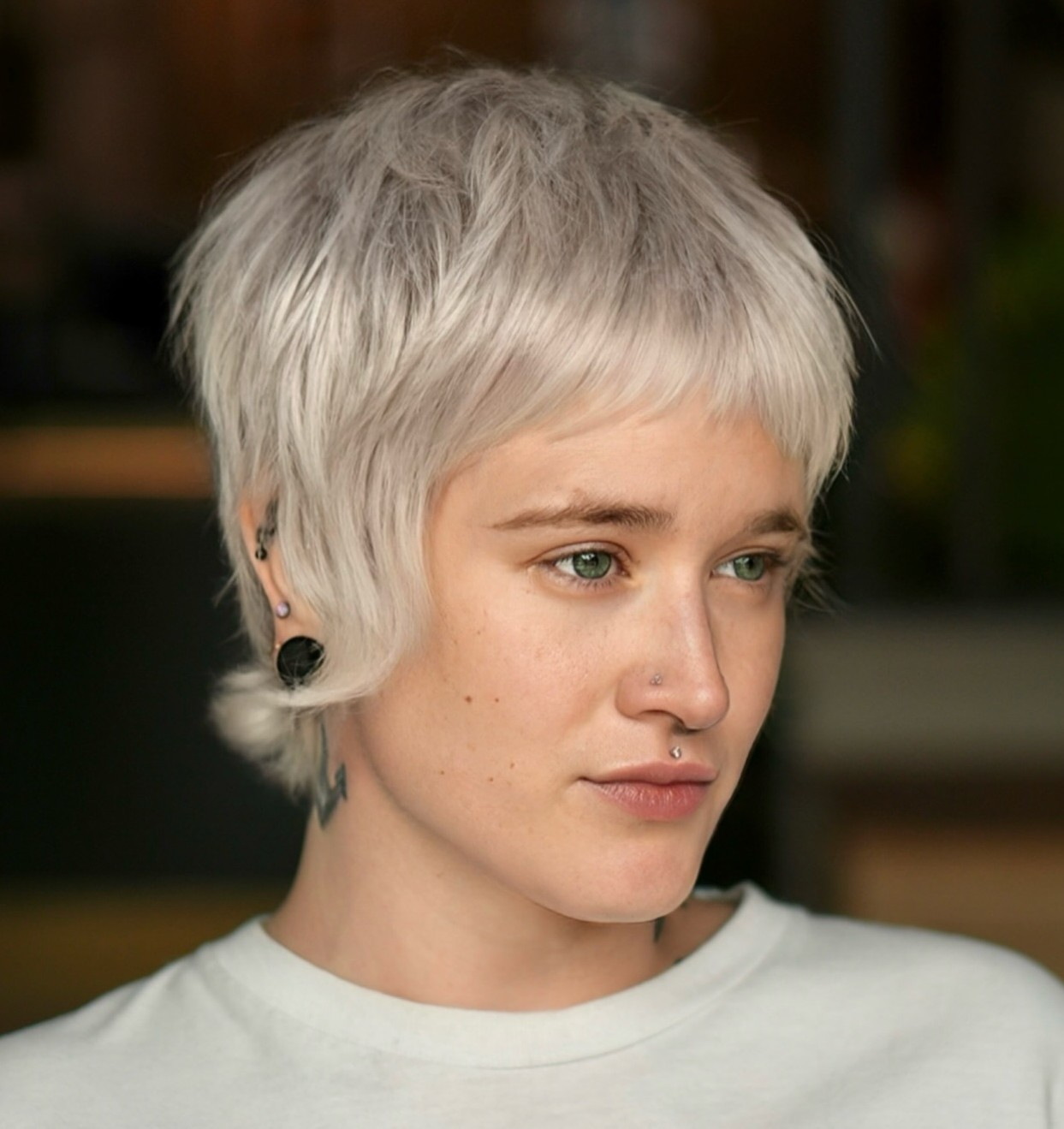 Short shaggy mullet with choppy micro bangs is an excellent way to shorten the long face while simultaneously creating the ideal oval face shape. With the “baby” bangs, you can break up harsh lines and visually shorten the high forehead, while opening up your facial features.