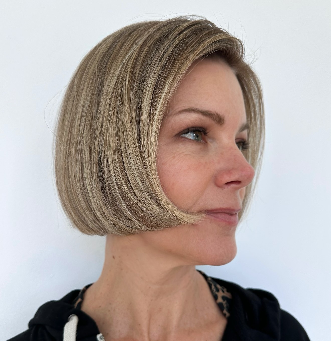 This straight angled bob haircut has been tousled and lifted at the roots for a style with edge and body without stretching your face out even more. The stunning caramel balayage also adds interest to the look.