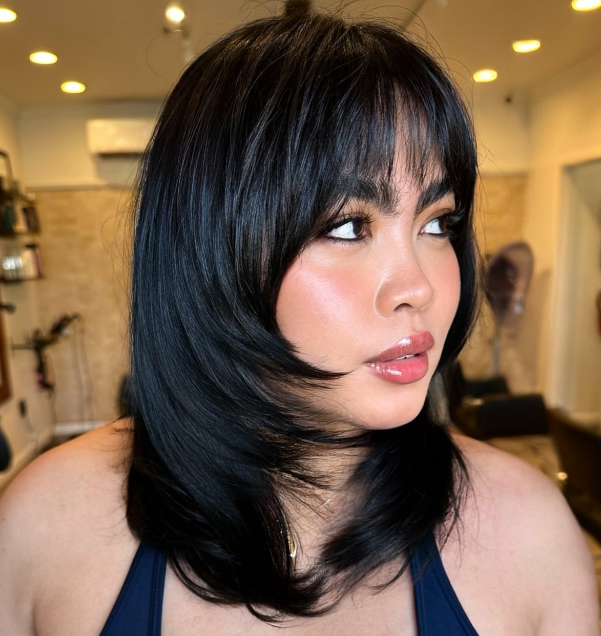 One way to style your hair is to create voluminous curls or waves for more texture and movement. But if that’s not your style and you love straight hair, then try a longer layered look with bangs. Ask your stylist to point cut these straight bangs at the ends instead of cutting them bluntly.