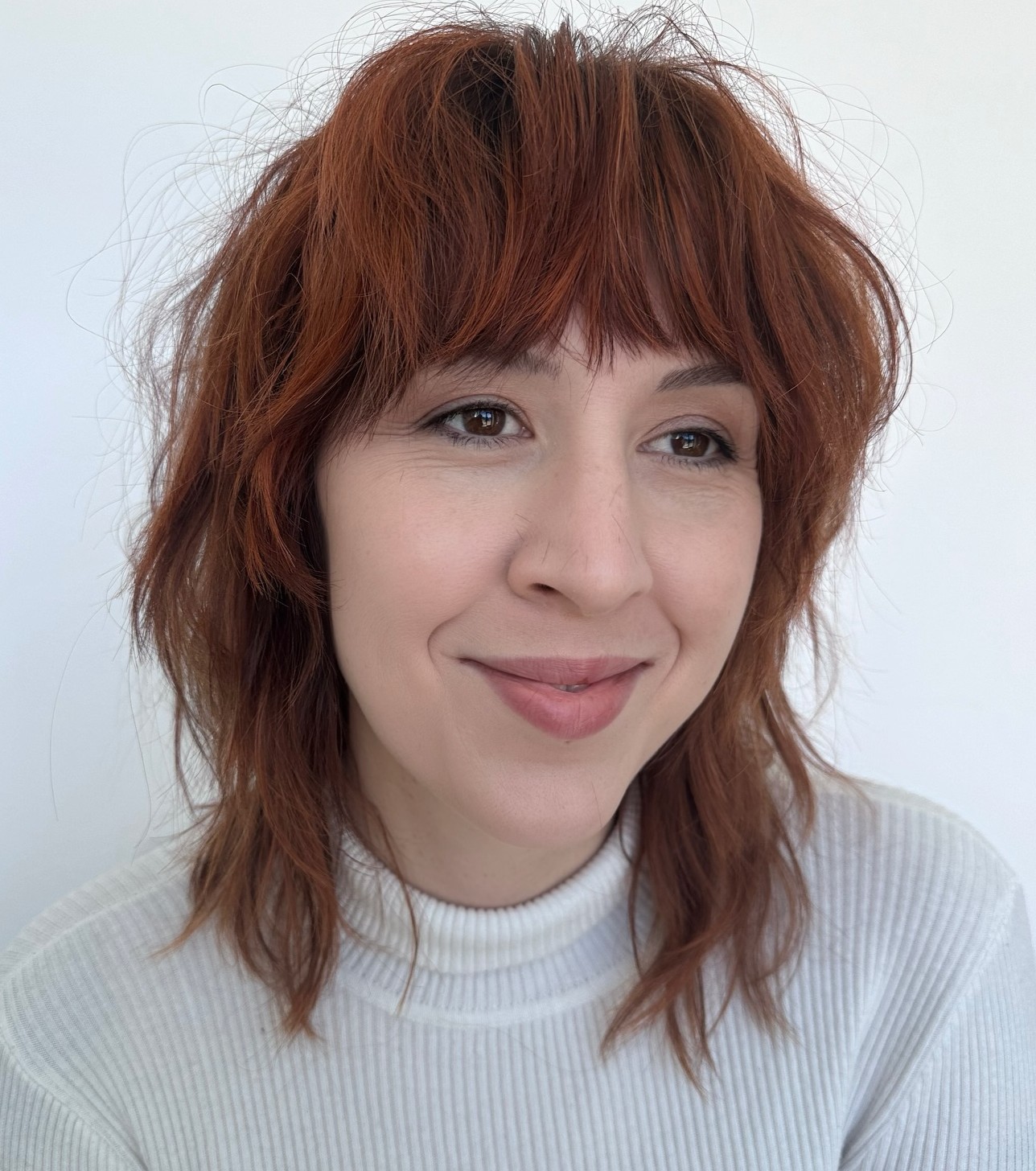 Short shaggy mullet with choppy micro bangs is an excellent way to shorten the long face while simultaneously creating the ideal oval face shape. With the “baby” bangs, you can break up harsh lines and visually shorten the high forehead, while opening up your facial features.