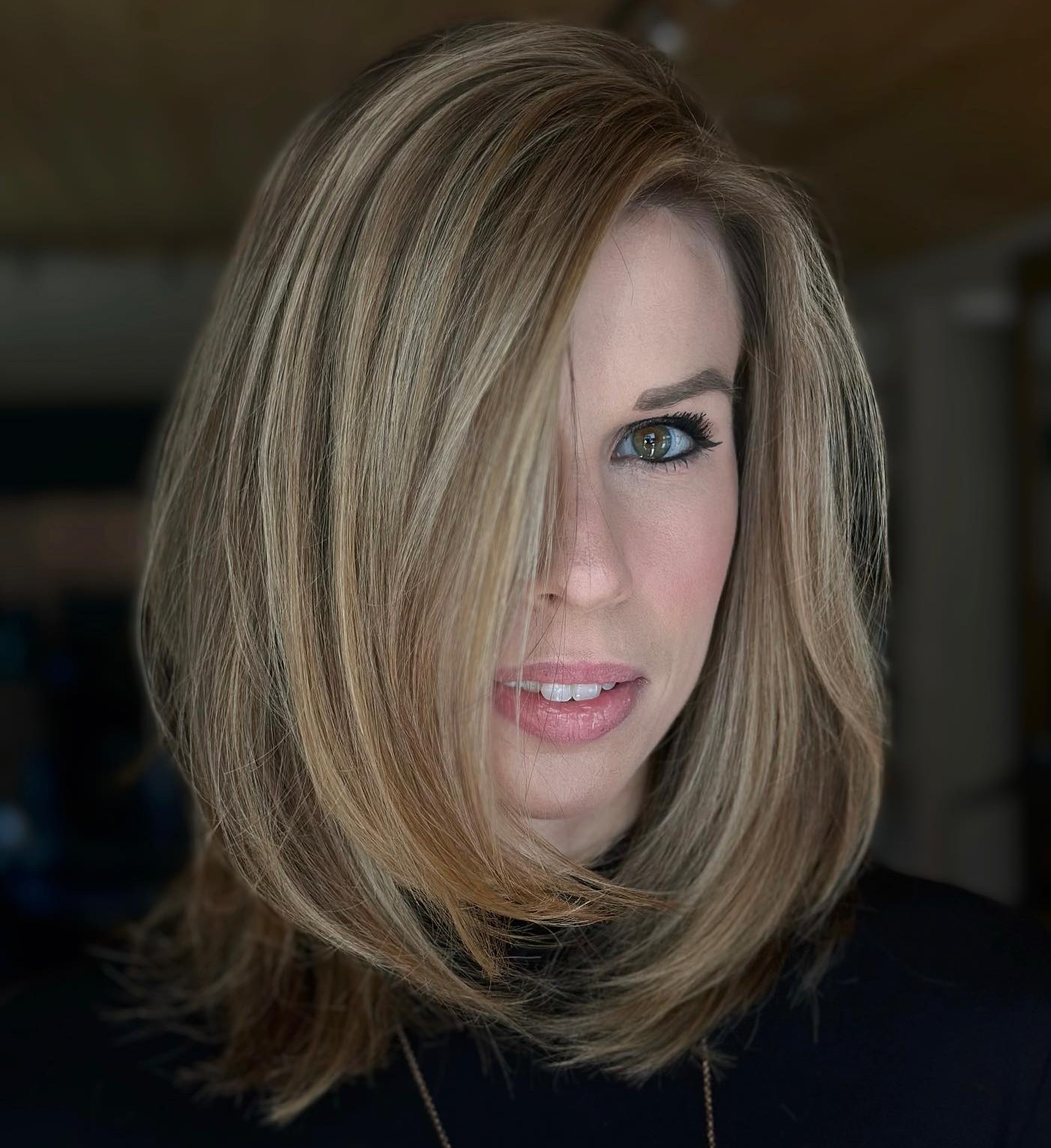 Ladies who are looking for a shorter style, but still want to keep a bit of length, should consider a bob haircut. While the cut may be classic, the tousled waves and subtle highlights make it modern and fresh. Plus, the volume of the style adds fullness to oblong thin faces.