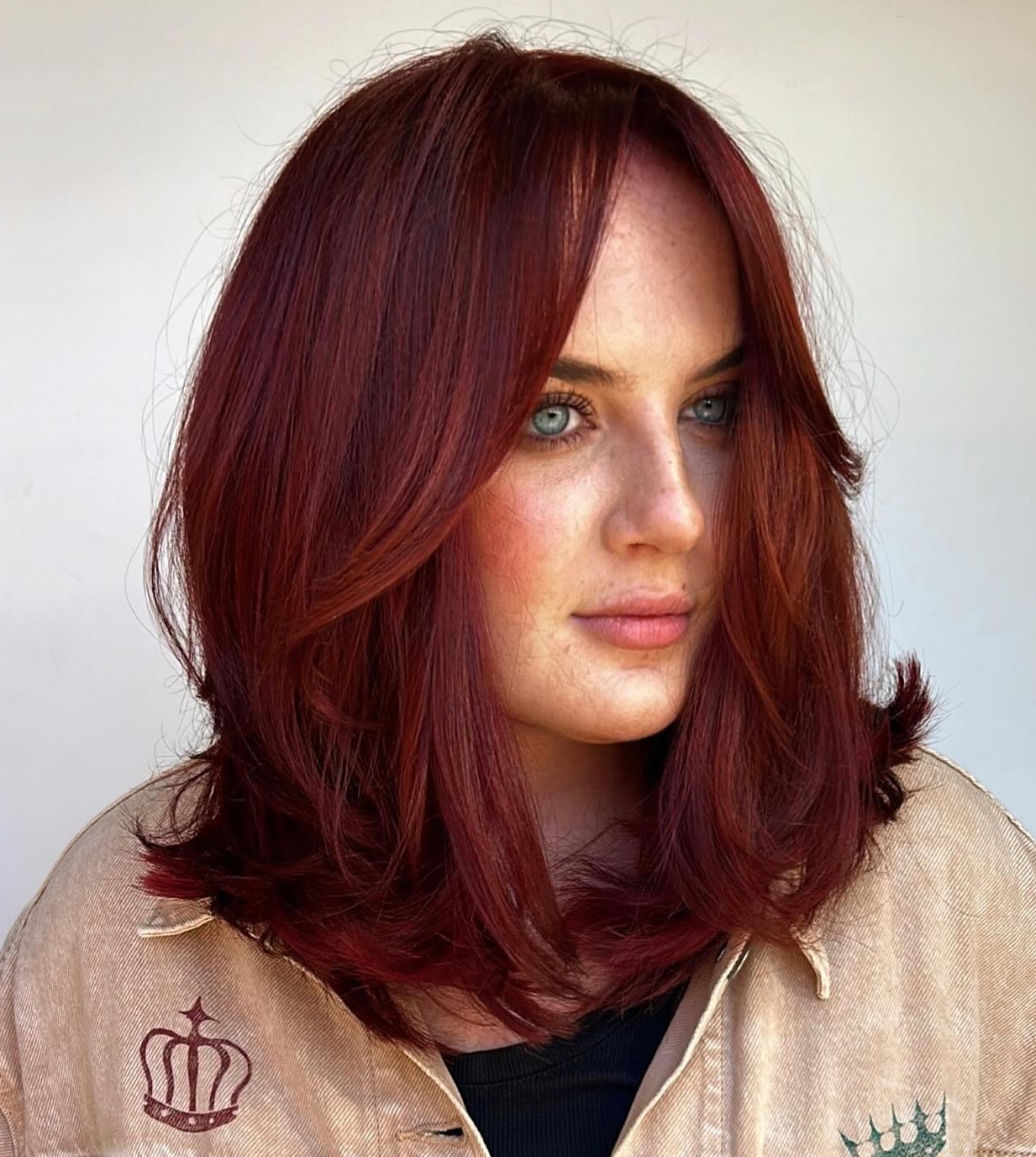Nothing works better with an oblong face shape than choppy layers. This slightly disheveled cut with the windblown effect helps draw attention to the eyes and lips. With so much volume and texture, you absolutely can’t go wrong!