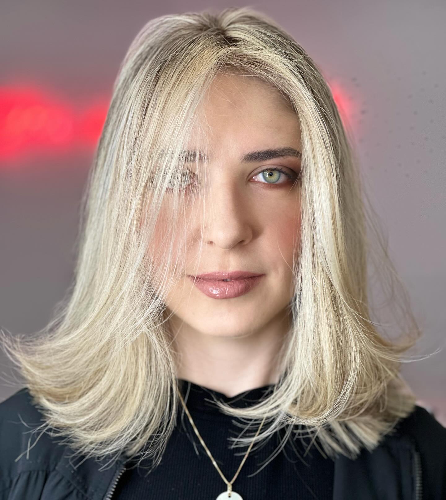 Bangs aren’t always necessary to flatter the face, as this example shows. A razored blonde lob can build body around your face and look effortlessly chic, especially if you ask your hairdresser to put in some extra feathered face-framing layers.