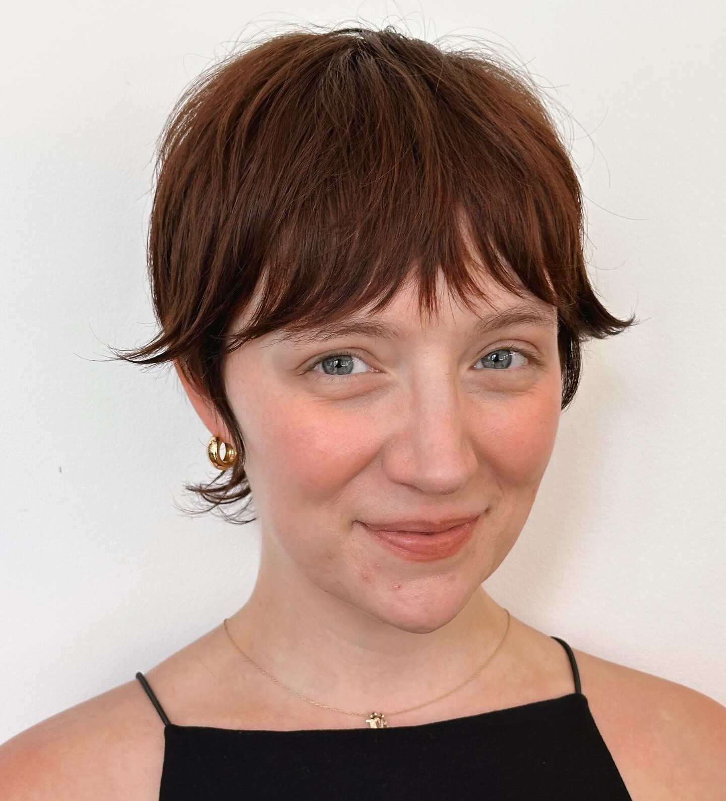 Short shaggy mullet with choppy micro bangs is an excellent way to shorten the long face while simultaneously creating the ideal oval face shape. With the “baby” bangs, you can break up harsh lines and visually shorten the high forehead, while opening up your facial features.
