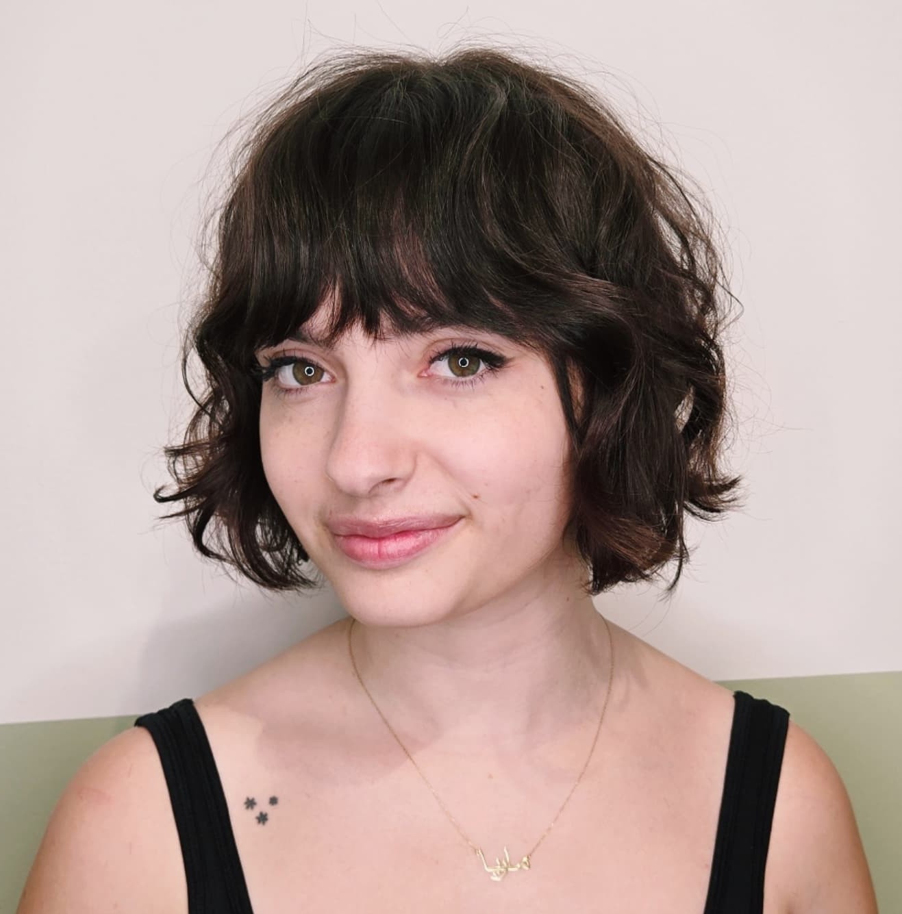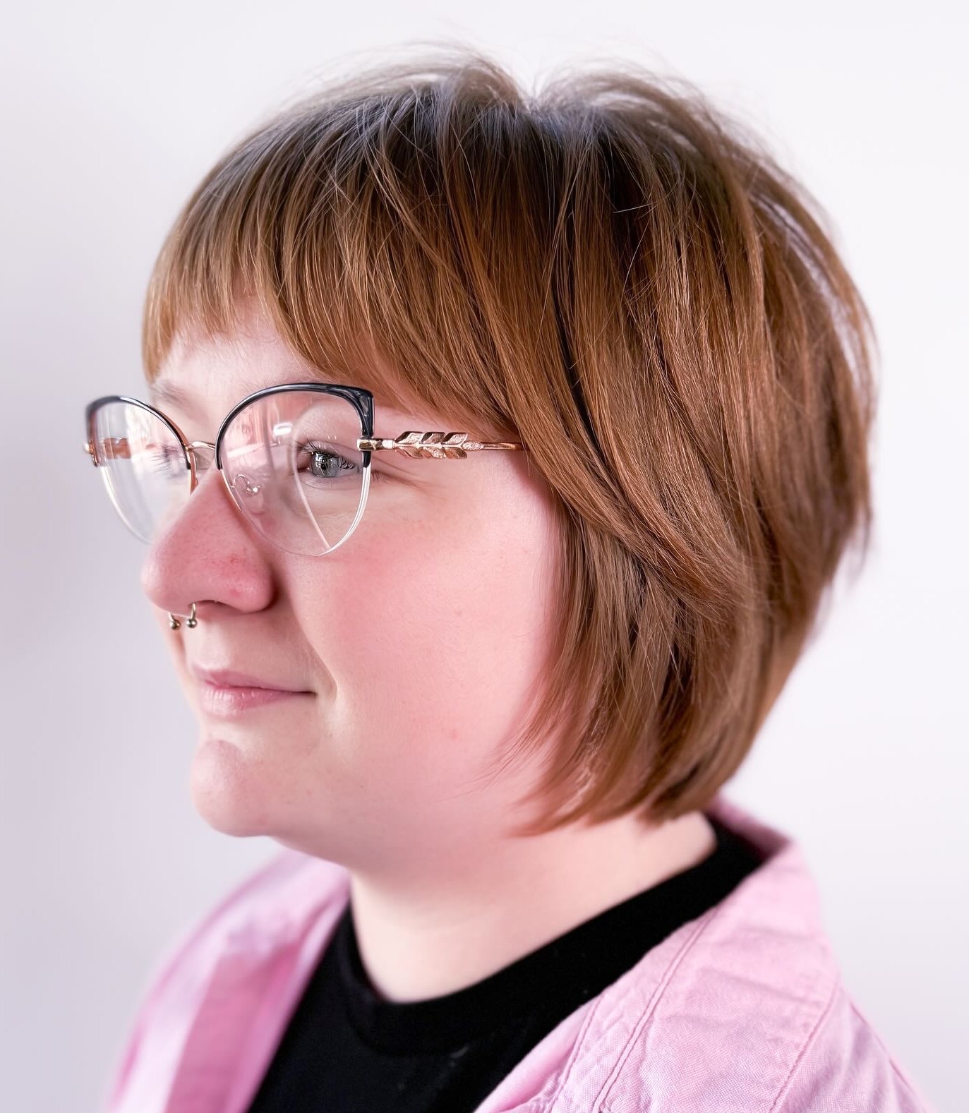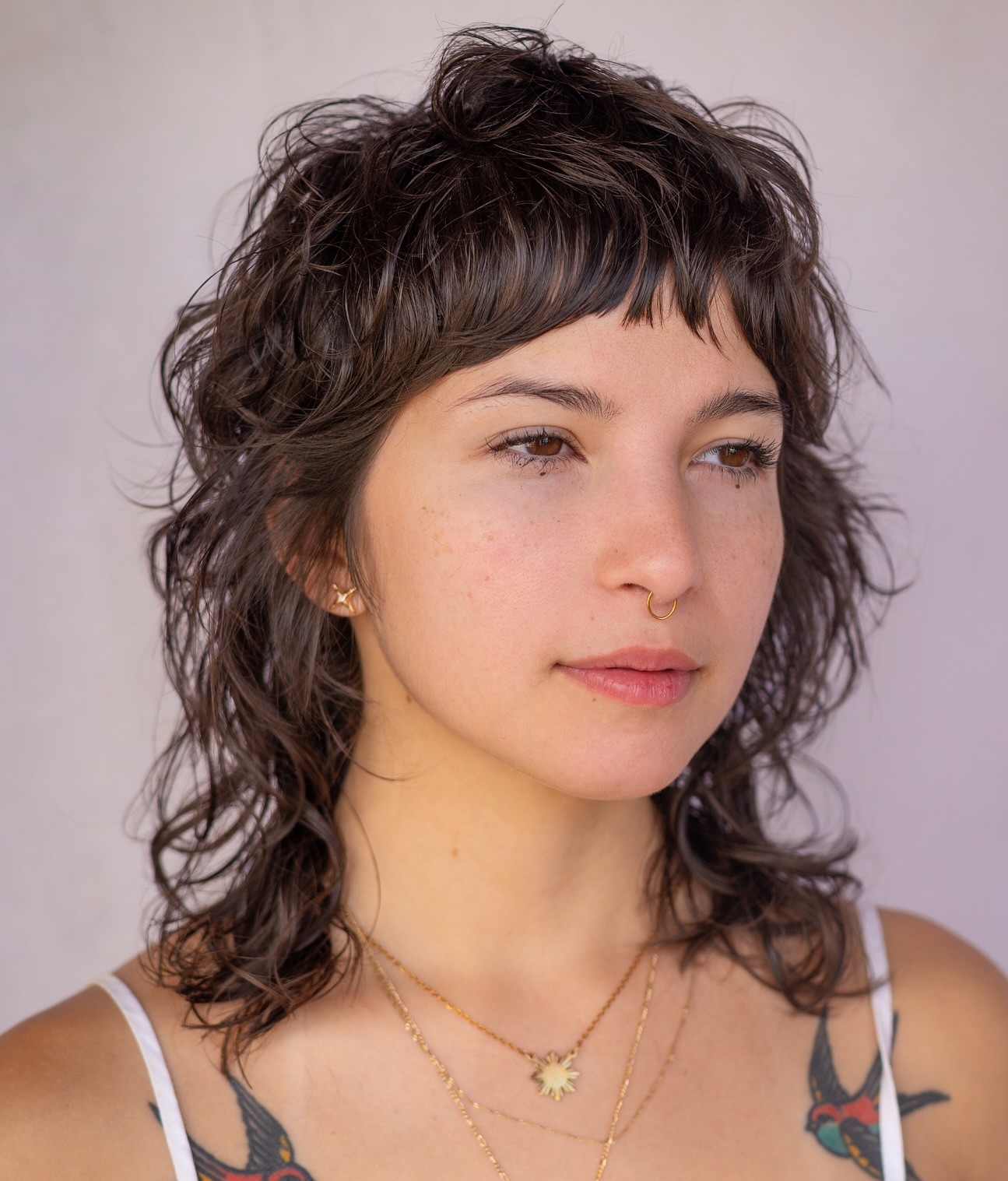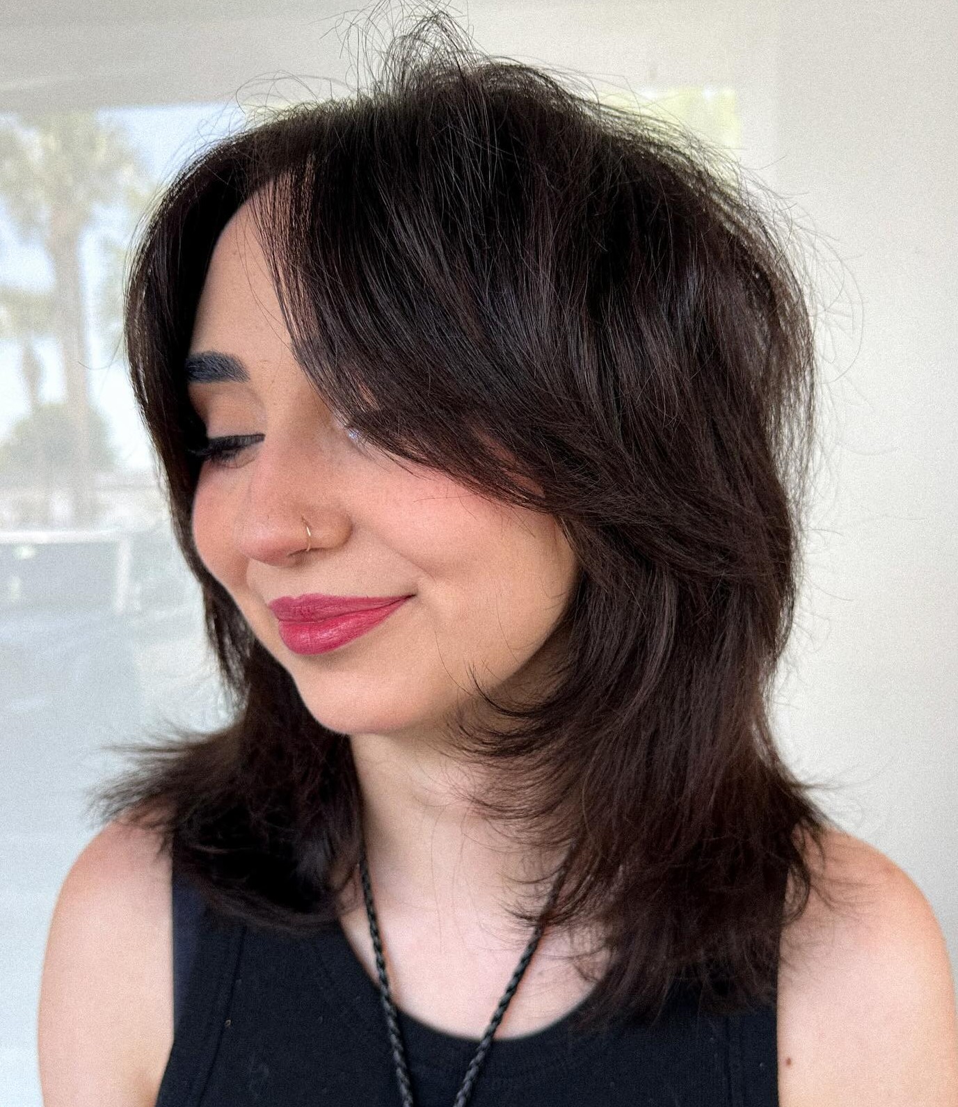 Piecey side bangs are fun to style, and when you get tired of them, they are so much easier to grow out. If you want to make your look more elegant, curl the ends of your locks for ’90s Rachel cut vibes.