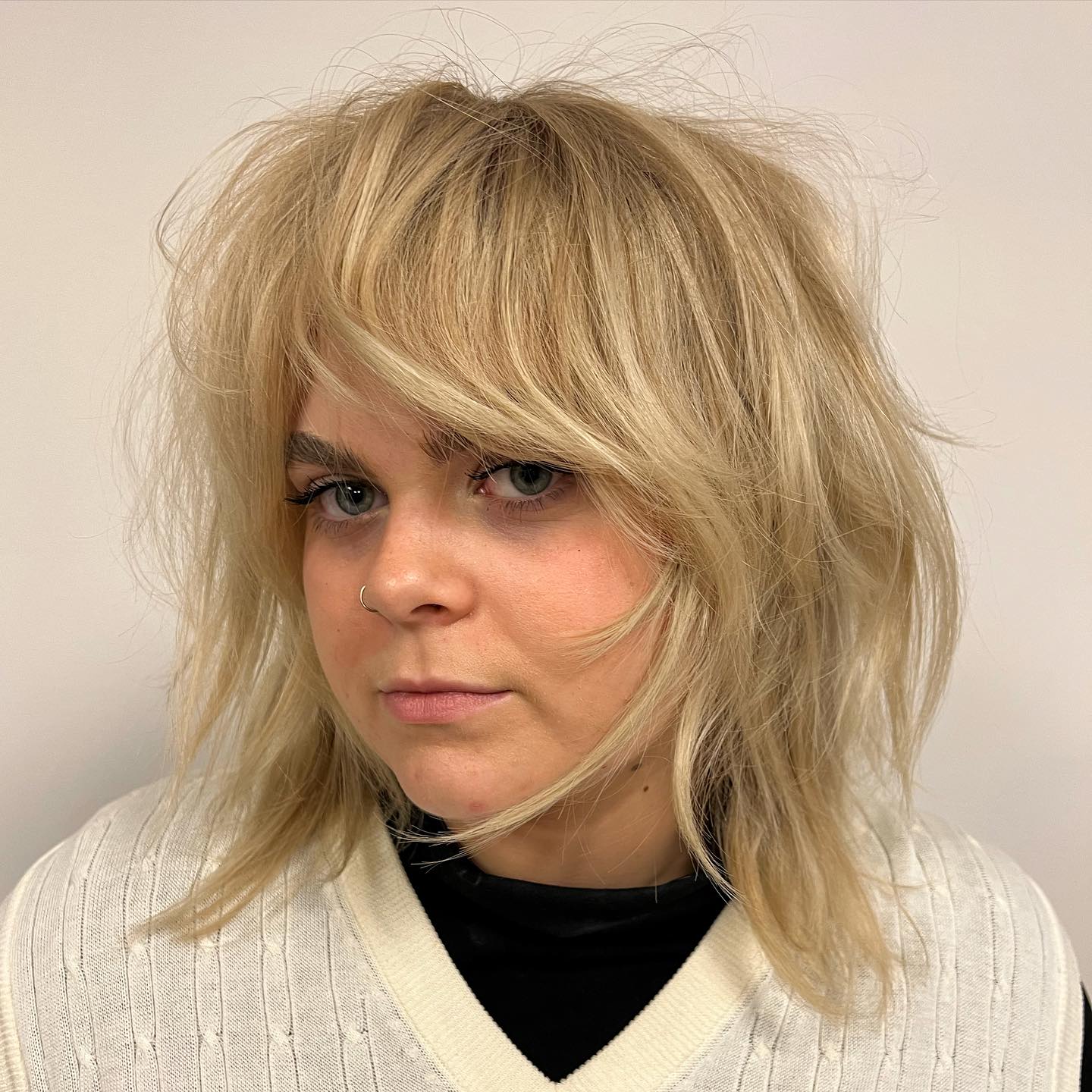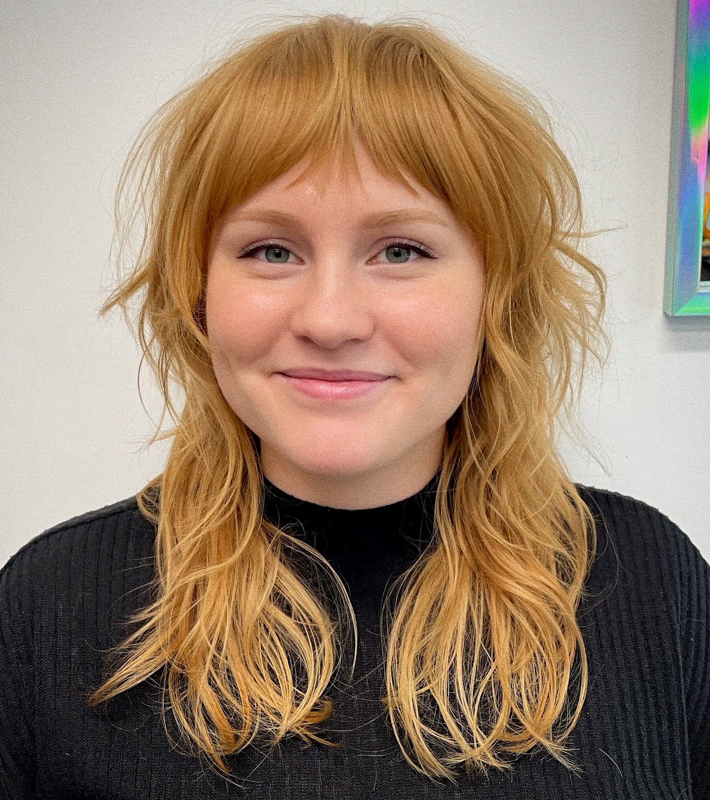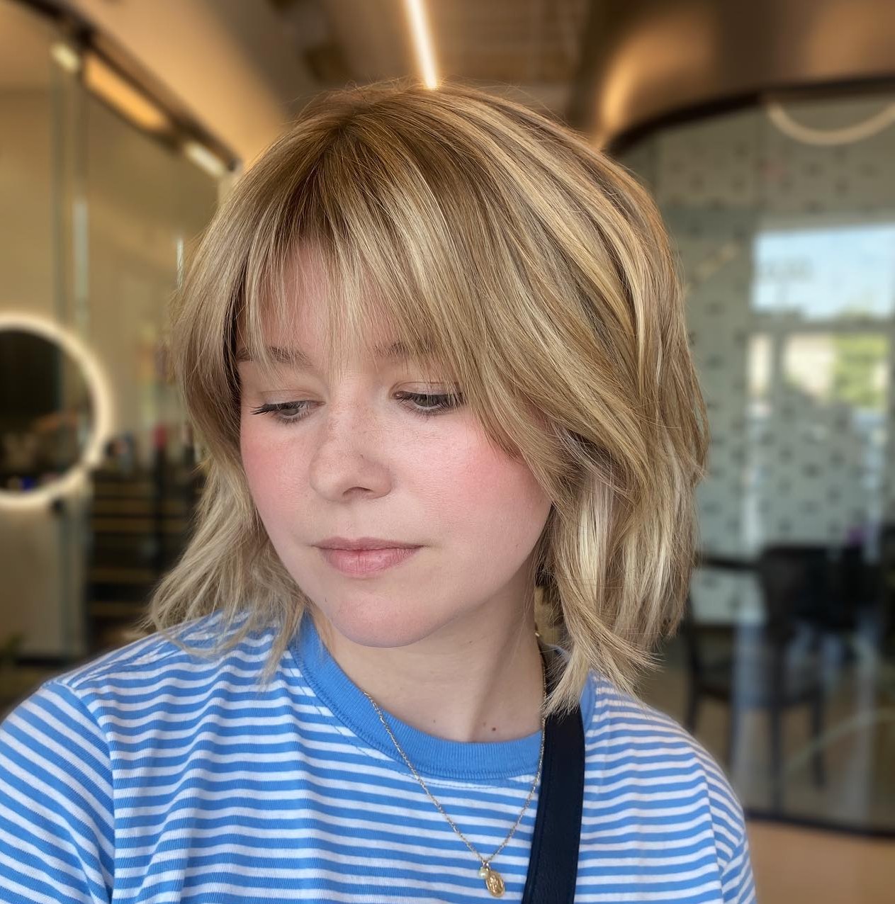Just because you have a fuller face does not mean that you can’t have fun with your look, isn’t it? The key to a creative hairstyle like this is a stylish wolf cut, a vivid hair color, and cool messy bangs. Looks pretty fascinating!