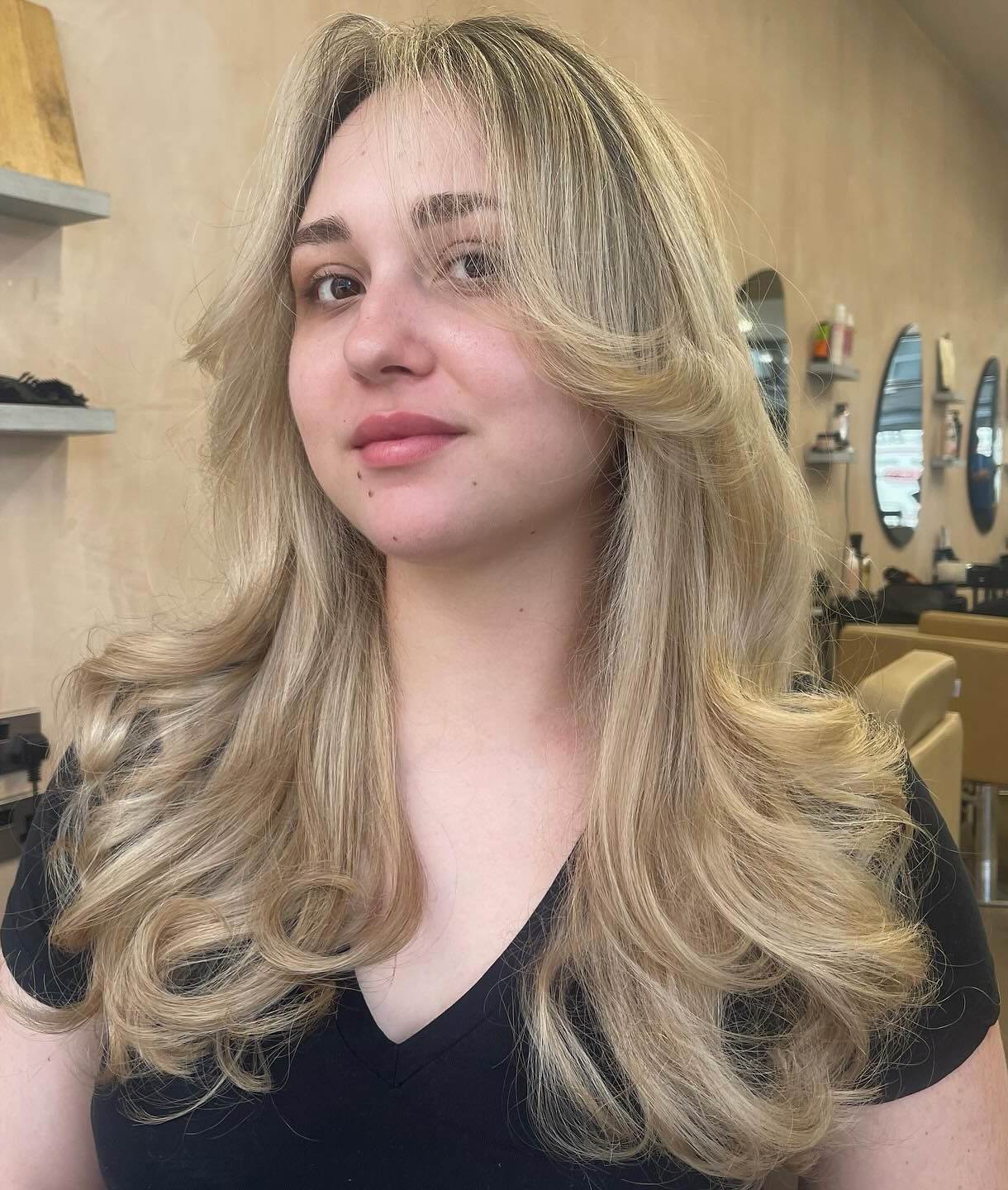 Lots of layers and swoopy bangs are essential for goddess-like tresses. They make thick strands weightless while allowing you to omit the daily styling.