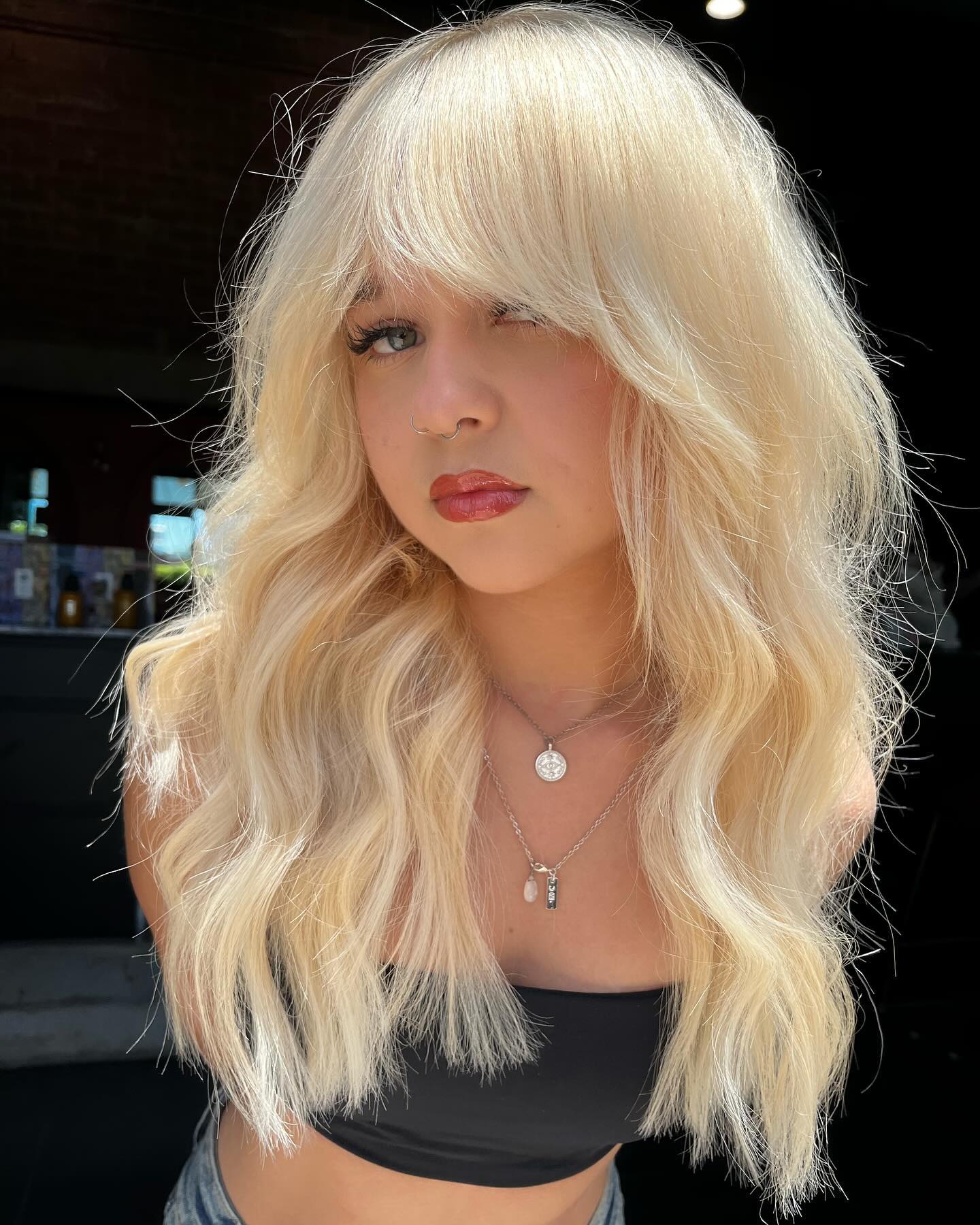 This stunning look was created by someone schooled in color theory. The wispy bangs and soft curls give the fairytale colors an extra fantasy element. This bang style is a gorgeous complement to ponytails and half-up half-down looks too. Updating the colors would definitely be high maintenance, but daily styling would be lots of fun!