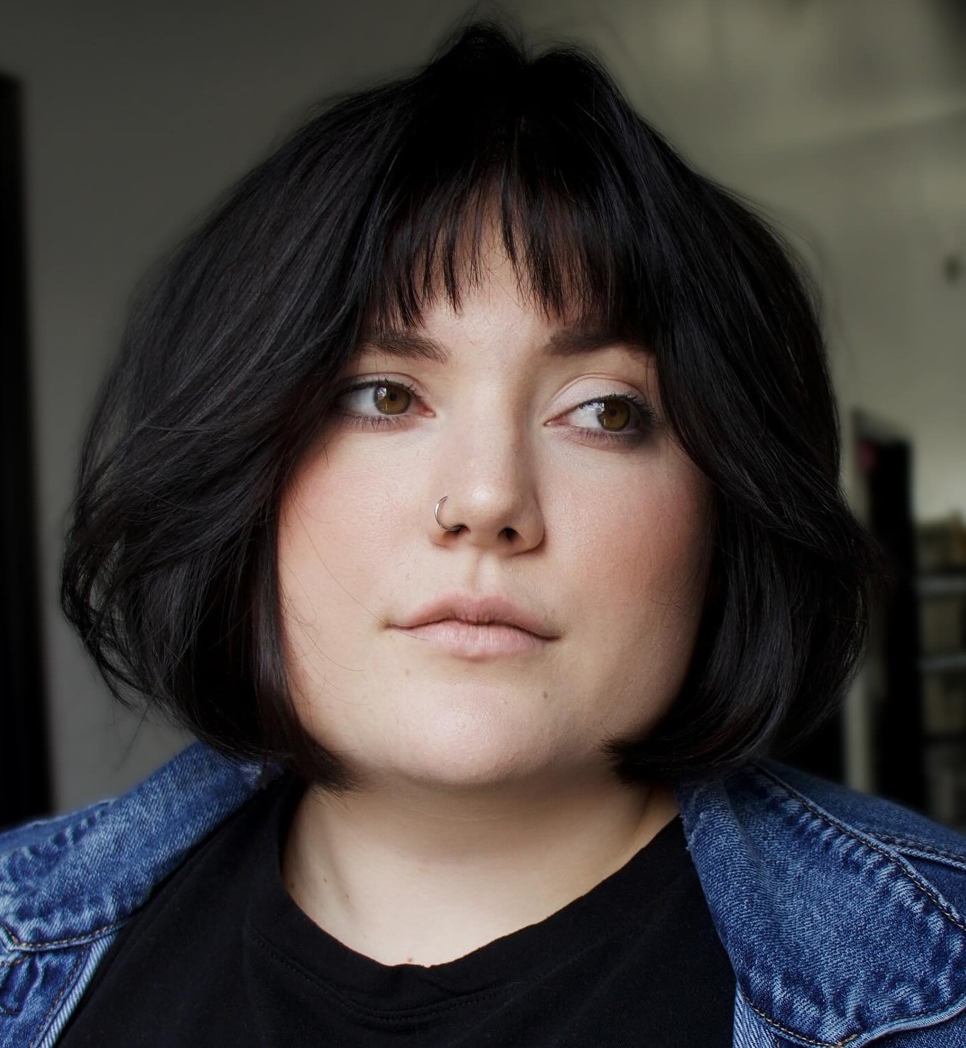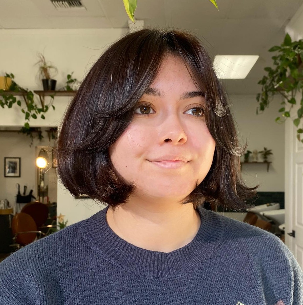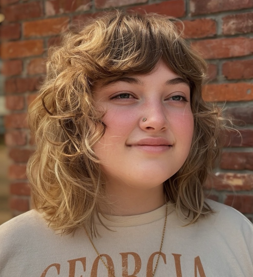 Just because you have a fuller face does not mean that you can’t have fun with your look, isn’t it? The key to a creative hairstyle like this is a stylish wolf cut, a vivid hair color, and cool messy bangs. Looks pretty fascinating!