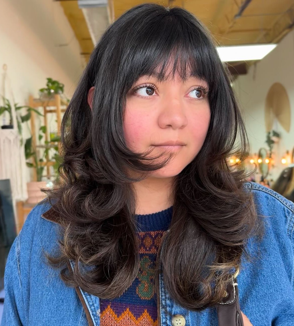 Layered textured bangs do look amazing on women with a big forehead and fuller cheeks. Pair them with a shaggy haircut to elongate your face and emphasize your facial features.