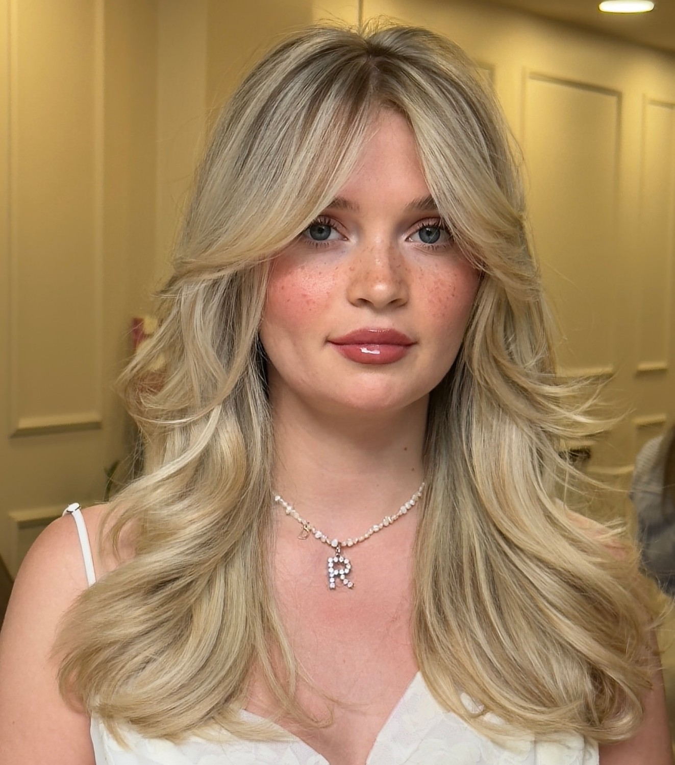 This hairstyle has tons of movement and is great for a girl who is constantly running her fingers through her hair and flipping it back and forth. It’s the I-don’t-need-a-part look. The bangs add to the fun, carefree essence of this style.