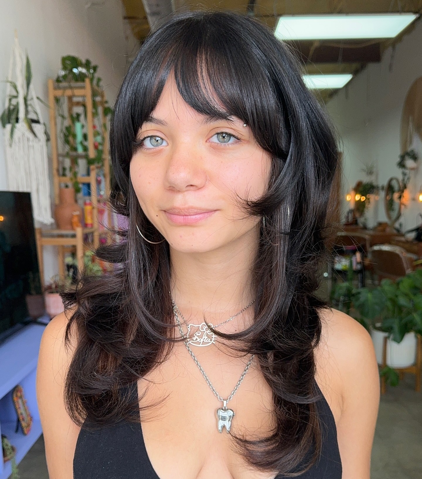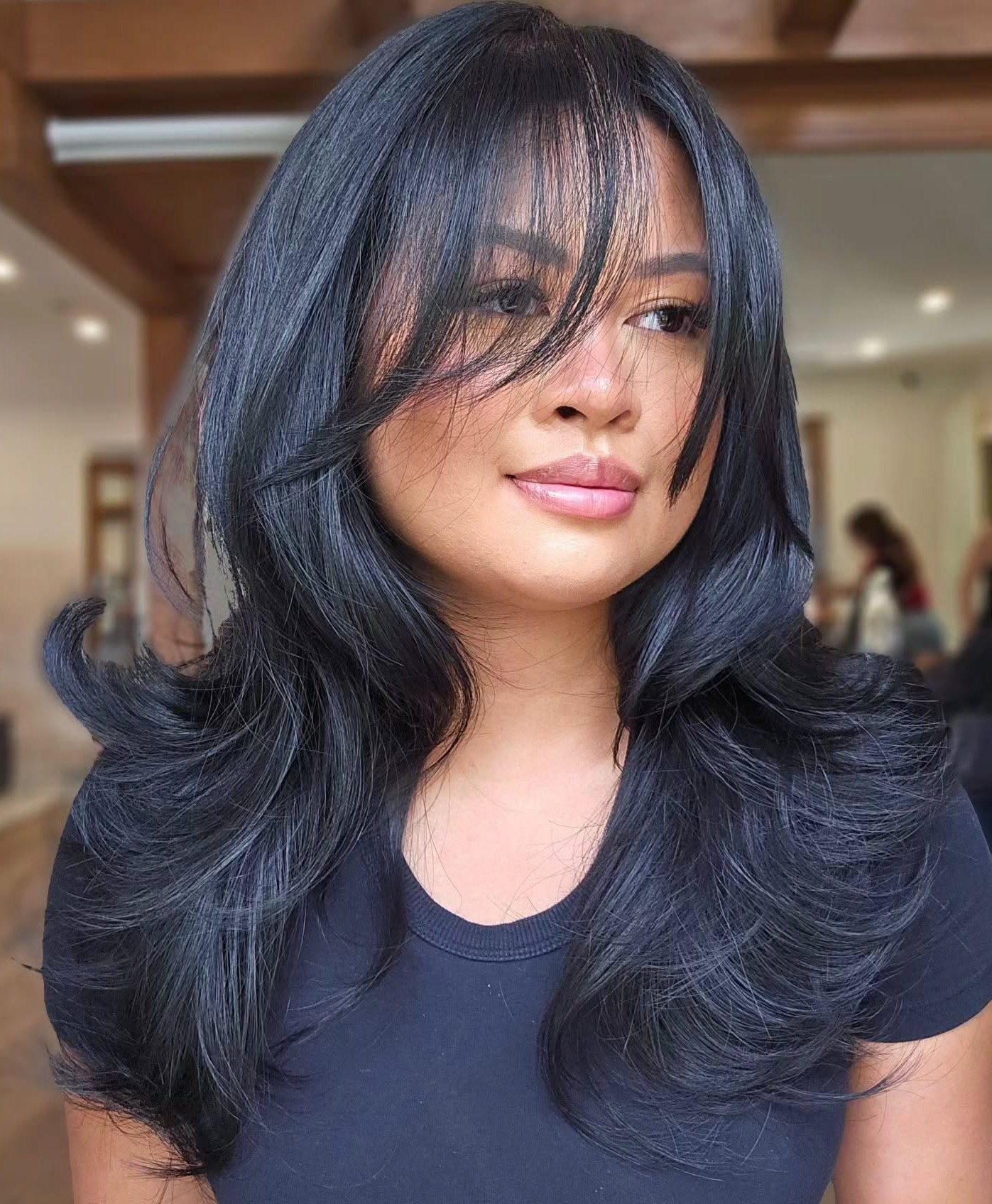 Lots of layers and swoopy bangs are essential for goddess-like tresses. They make thick strands weightless while allowing you to omit the daily styling.