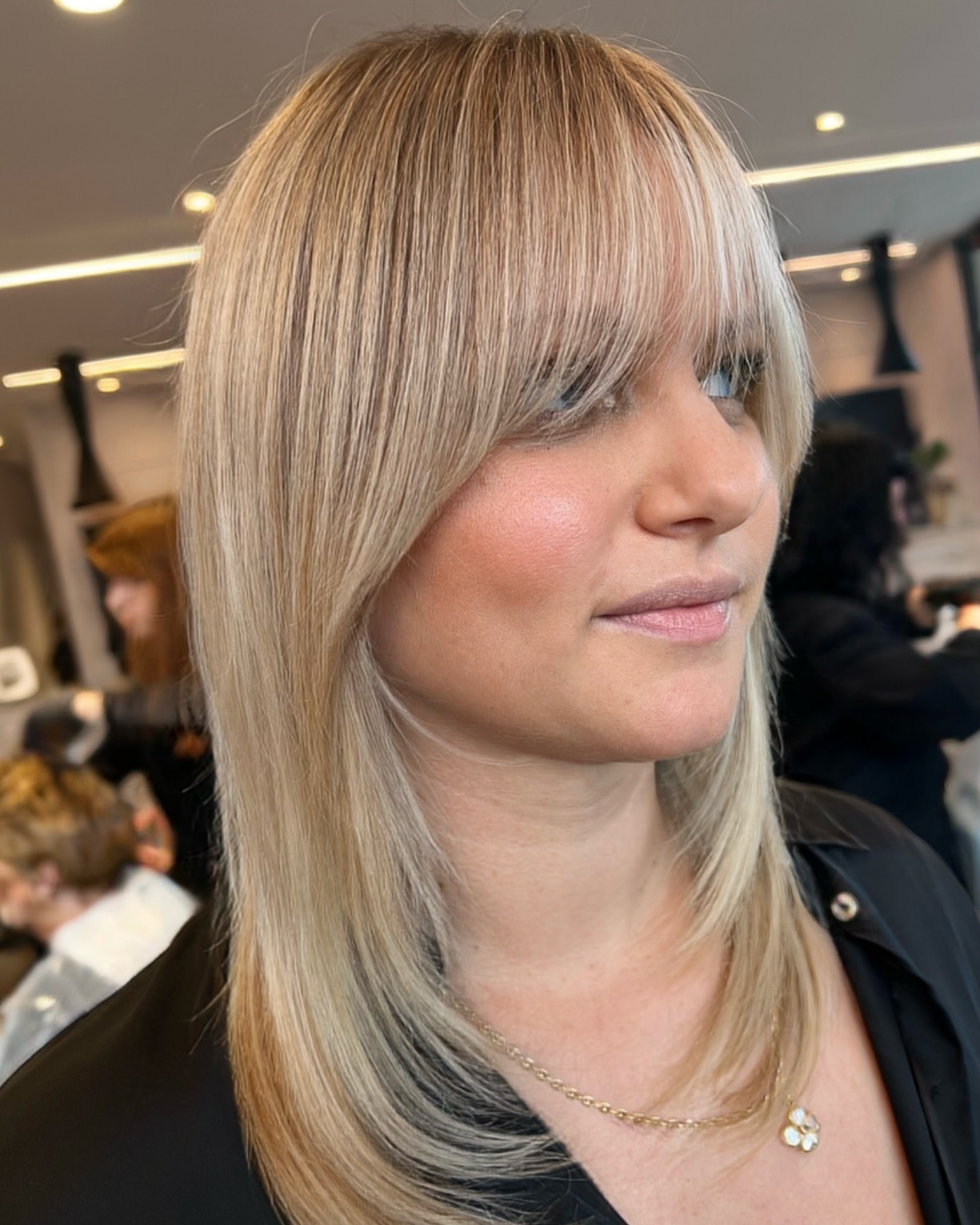 As blunt bangs can sometimes cut off the face and bring the focus right to the widest part, it’s better to choose wispy ones. Just like the fringe in this photo, which shows more of the face, thus elongating and slimming the visage.