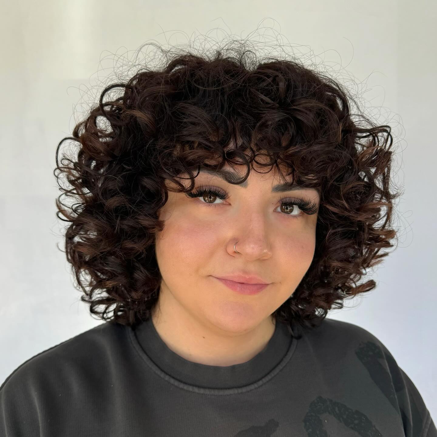 Curls work great with circular faces and cute curly bangs are a perfect addition. Complement this hairstyle with subtle highlights for extra interest points. This is one of the best styles for ladies with a fuller face and natural curls.