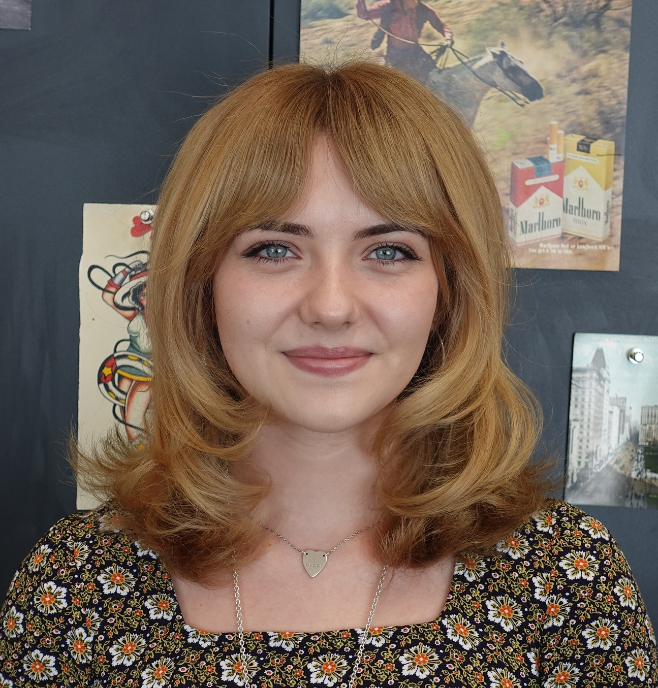 As blunt bangs can sometimes cut off the face and bring the focus right to the widest part, it’s better to choose wispy ones. Just like the fringe in this photo, which shows more of the face, thus elongating and slimming the visage.