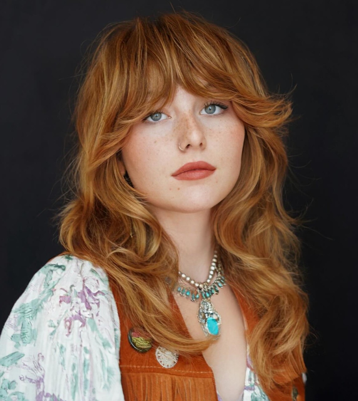 Layered textured bangs do look amazing on women with a big forehead and fuller cheeks. Pair them with a shaggy haircut to elongate your face and emphasize your facial features.