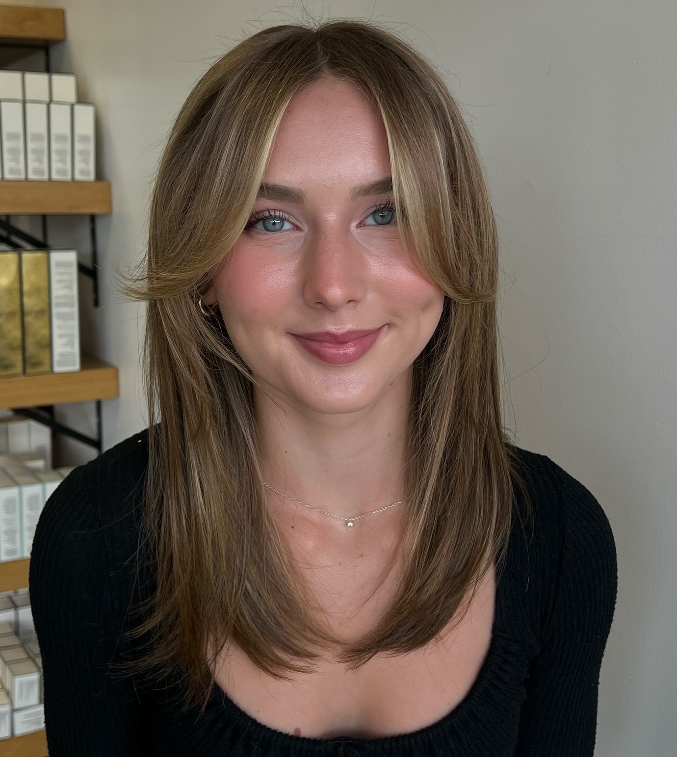 Lots of layers and swoopy bangs are essential for goddess-like tresses. They make thick strands weightless while allowing you to omit the daily styling.