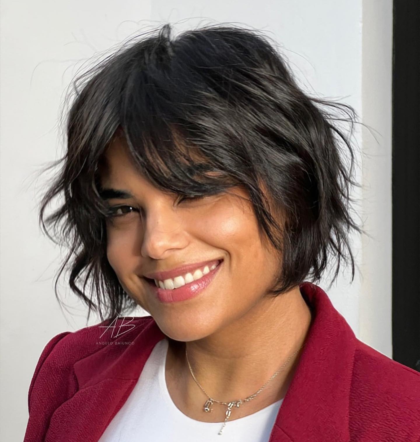 If you’re willing to add a little more texture and movement to your hair, consider this short wavy cut with bangs. With these amazing bangs, your short messy haircut will look cuter and more elegant. Also, it will work well for women with both thick and thin hair types.