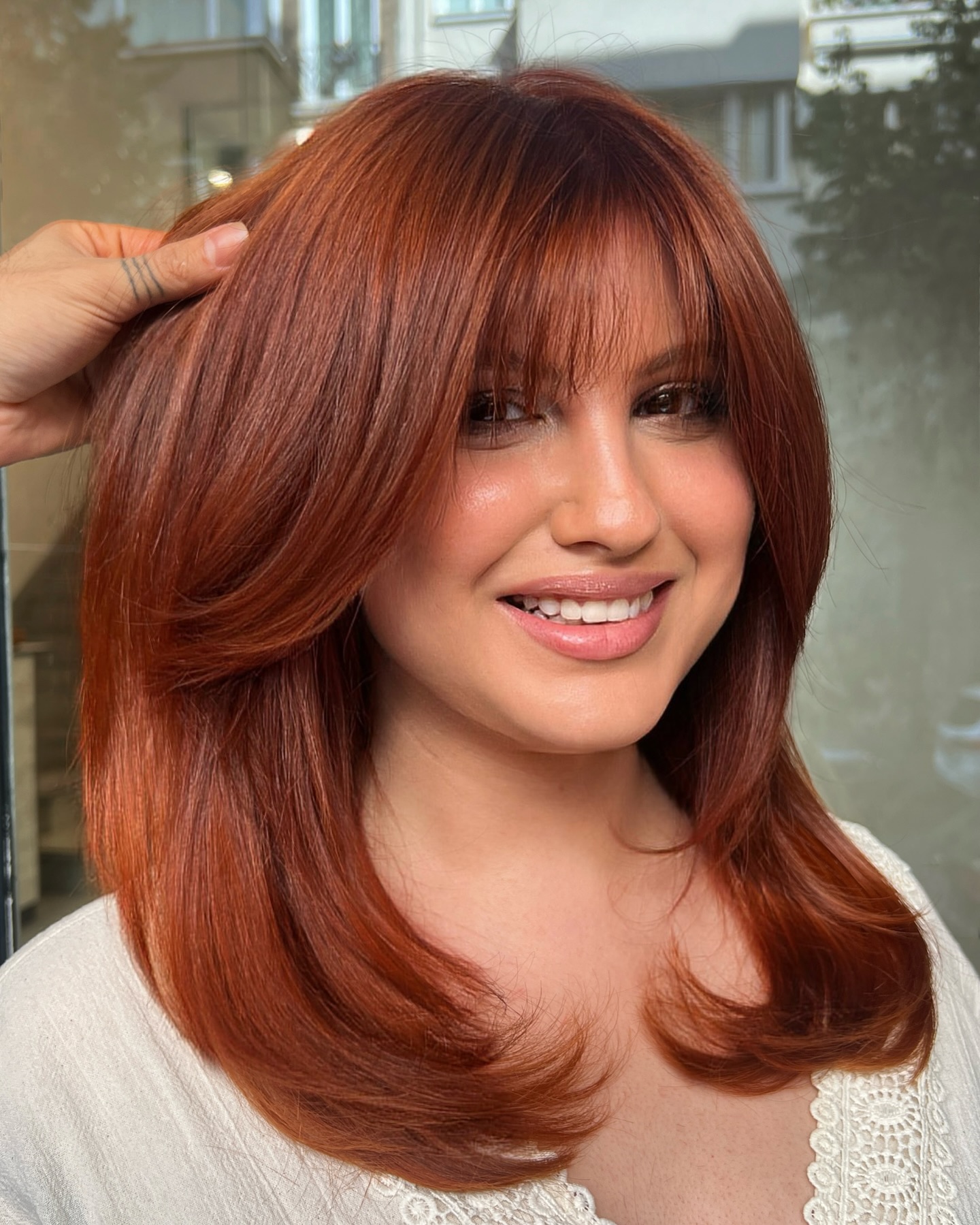 Layered textured bangs do look amazing on women with a big forehead and fuller cheeks. Pair them with a shaggy haircut to elongate your face and emphasize your facial features.