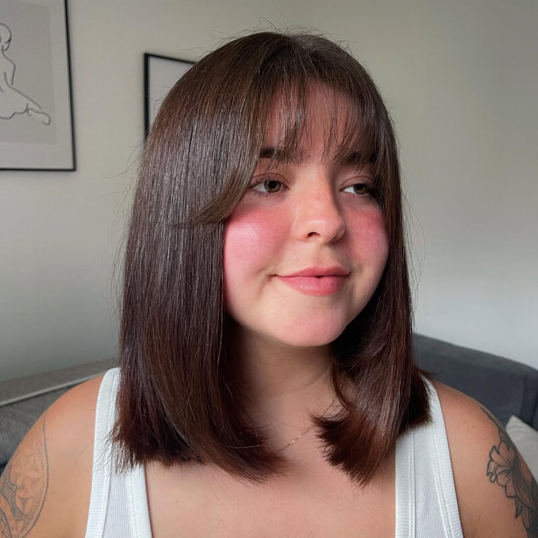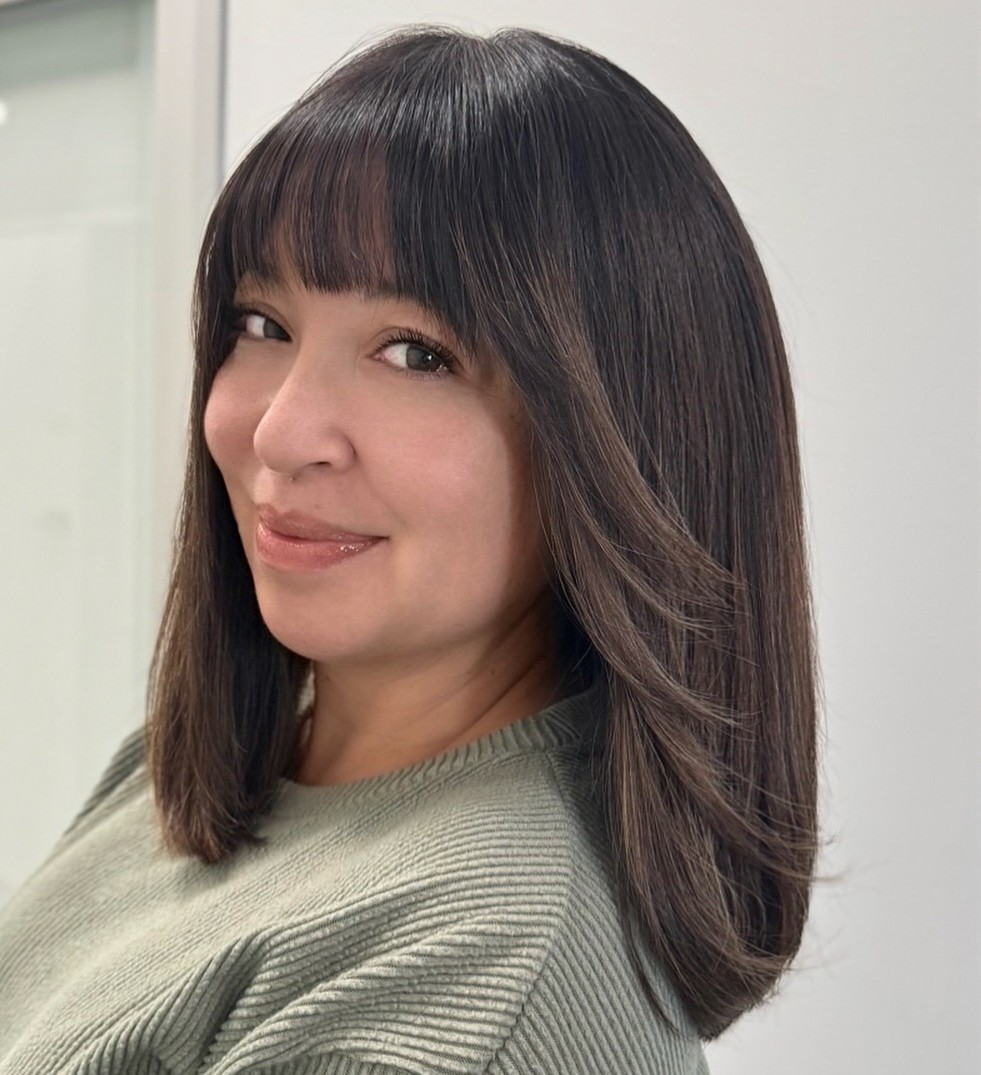 This hairstyle is one hundred percent about gloss. Bangs can absolutely be straight, elegant, and full of shine – a simple choice that really showcases your luscious, healthy strands.