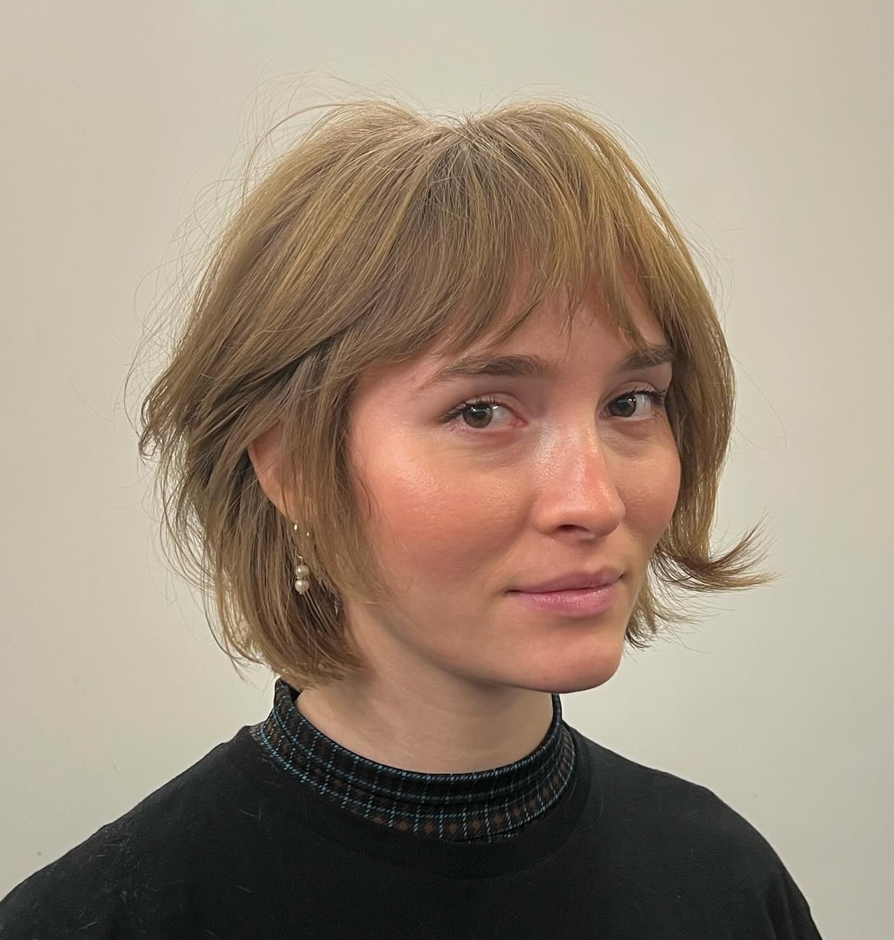 Do you want to do something more creative than simple straight or blunt bangs? The neck-length bob with baby bangs slims down the face, turning the cut into one of the best short hairstyles for a round face shape. Plus, thick short bangs lift the forehead and make the look open.