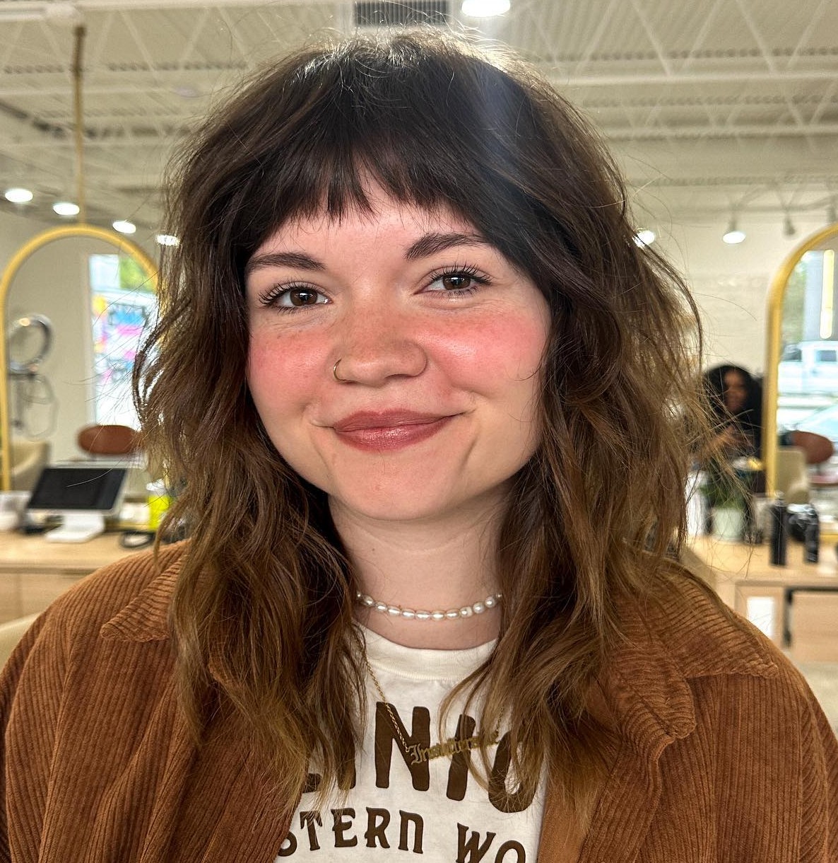 Here’s another example of straight bangs that may work for a round or oval face if they are combined with edgy waves. Adding soft waves gives lift and, as always, shows off highlights. You may choose to keep hair ends straight to match the straight-across bangs.