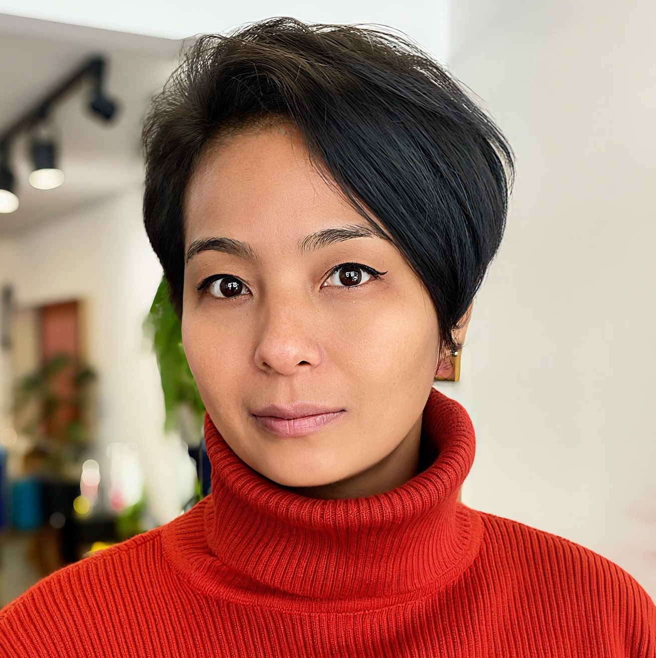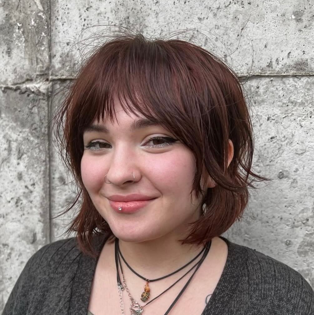 Just because you have a fuller face does not mean that you can’t have fun with your look, isn’t it? The key to a creative hairstyle like this is a stylish wolf cut, a vivid hair color, and cool messy bangs. Looks pretty fascinating!