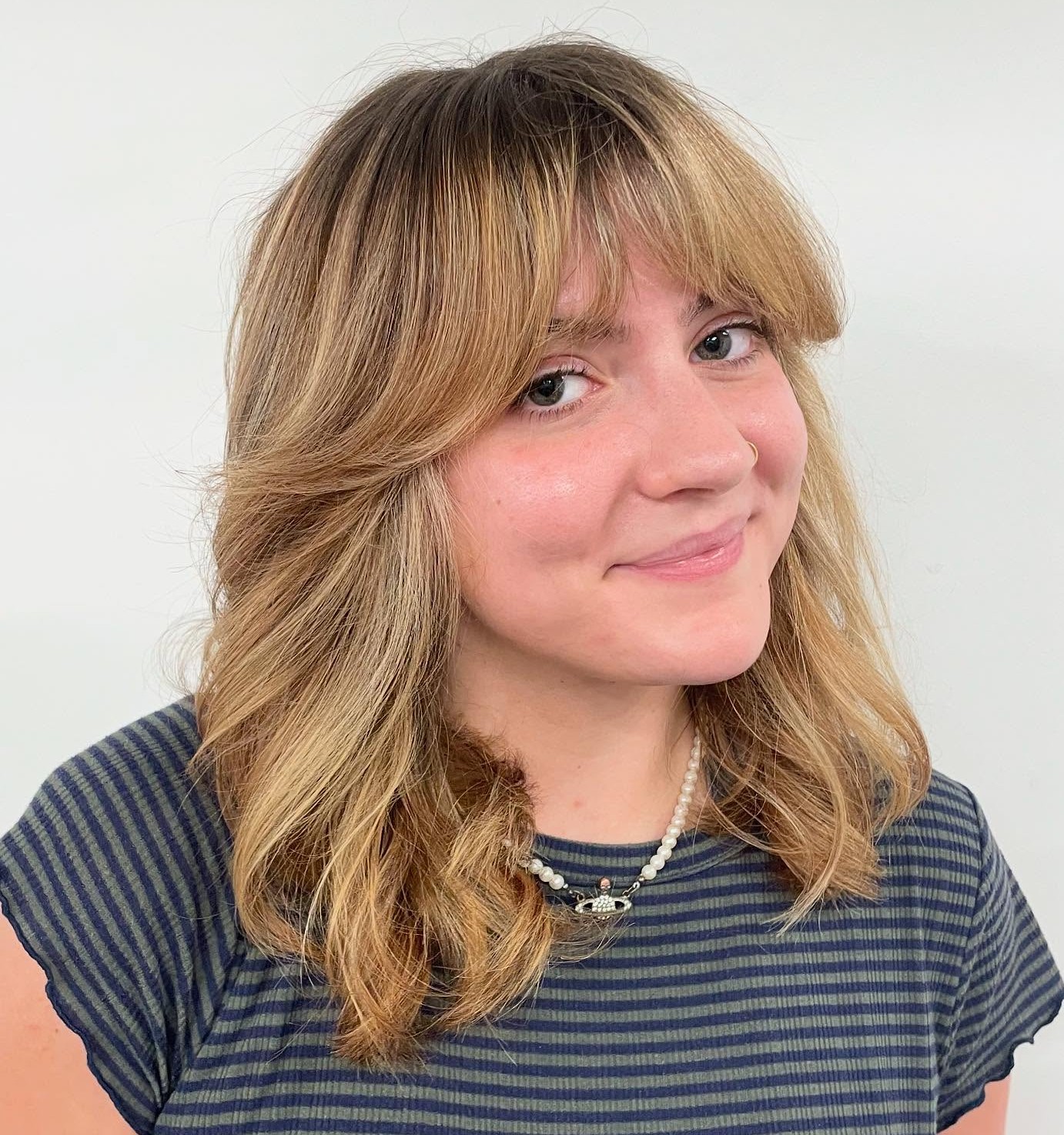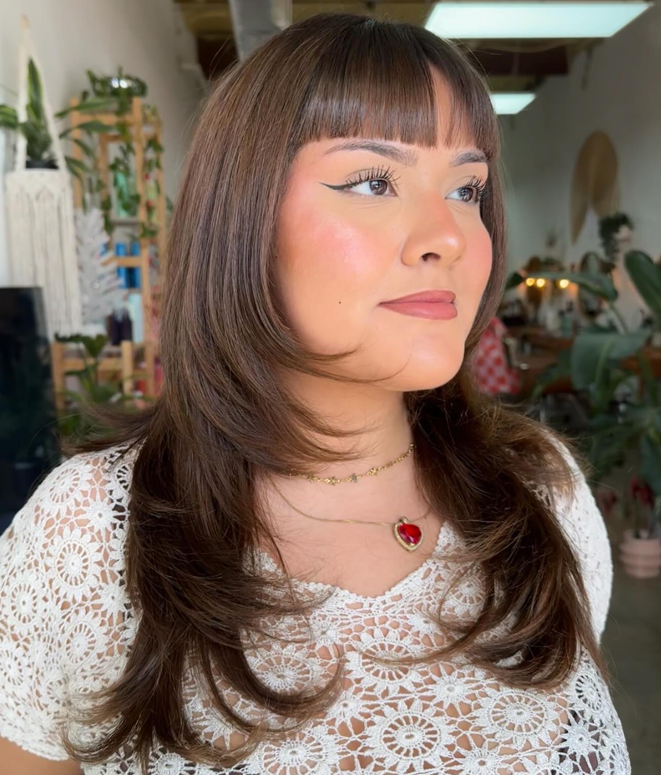 Layered textured bangs do look amazing on women with a big forehead and fuller cheeks. Pair them with a shaggy haircut to elongate your face and emphasize your facial features.
