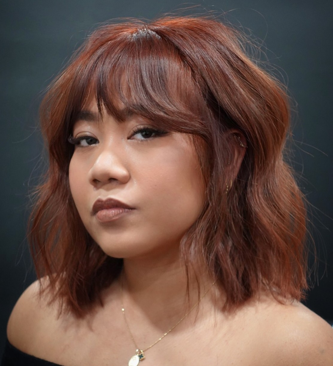 Just because you have a fuller face does not mean that you can’t have fun with your look, isn’t it? The key to a creative hairstyle like this is a stylish wolf cut, a vivid hair color, and cool messy bangs. Looks pretty fascinating!
