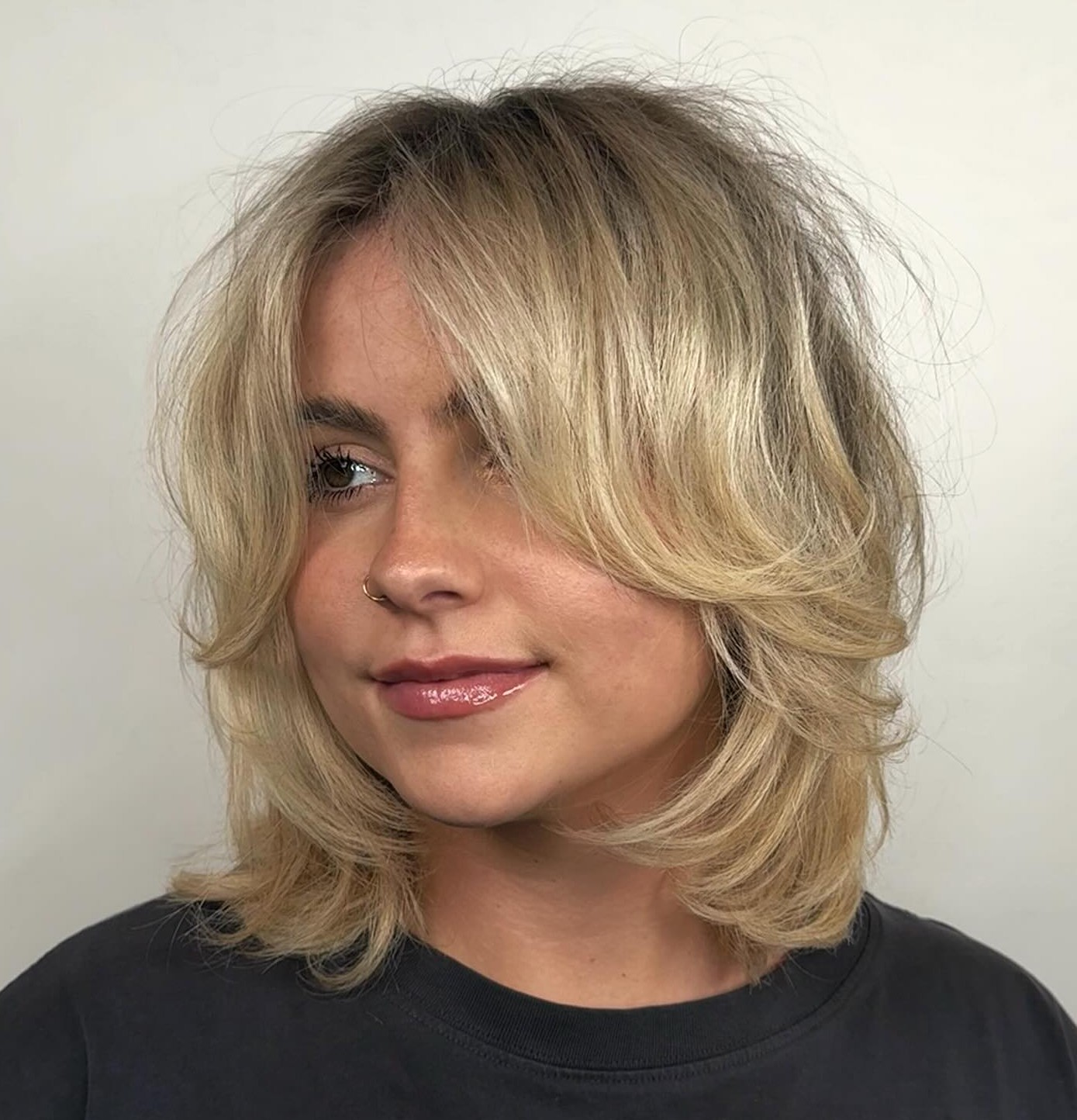 Layered textured bangs do look amazing on women with a big forehead and fuller cheeks. Pair them with a shaggy haircut to elongate your face and emphasize your facial features.