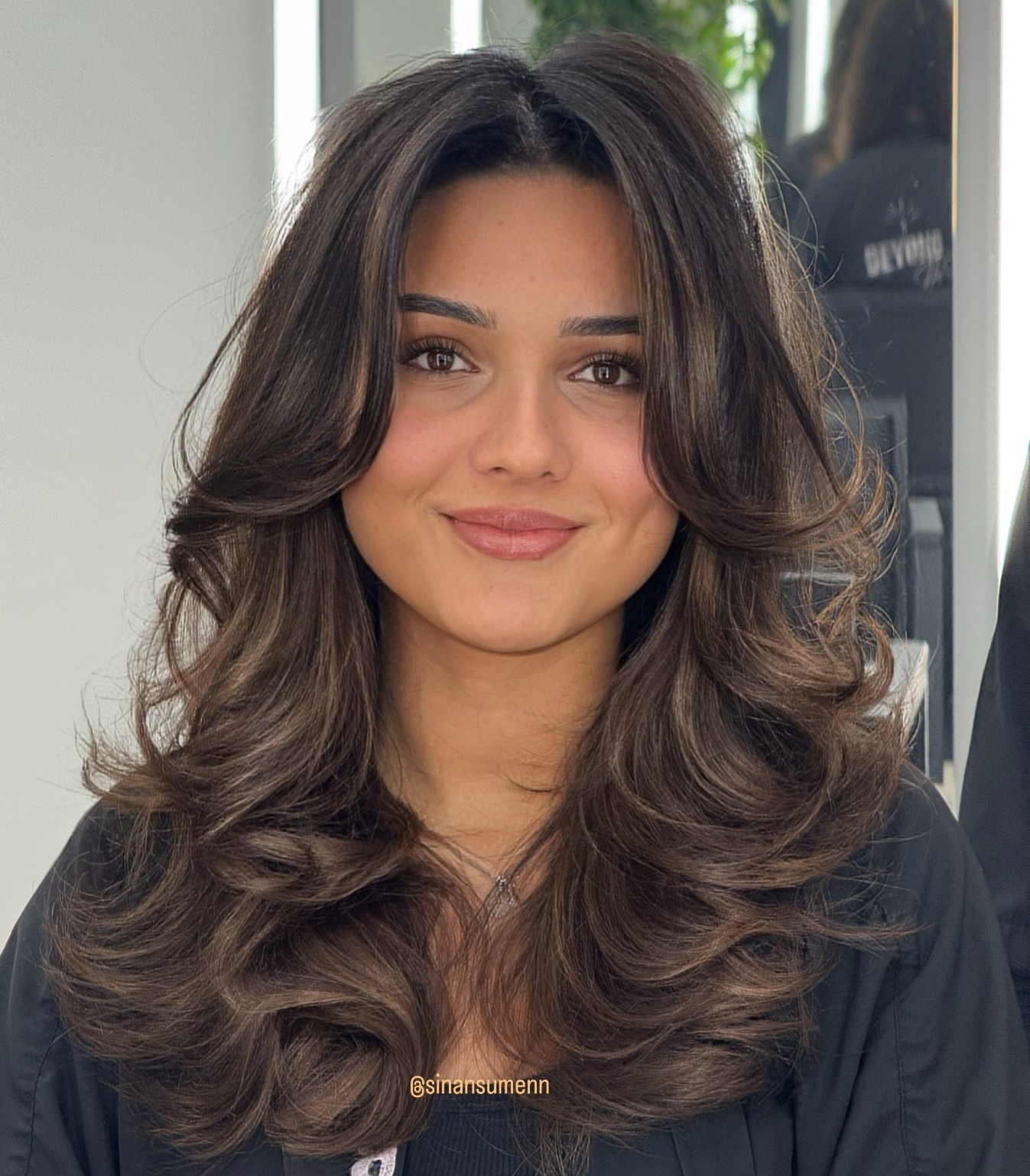 Lots of layers and swoopy bangs are essential for goddess-like tresses. They make thick strands weightless while allowing you to omit the daily styling.