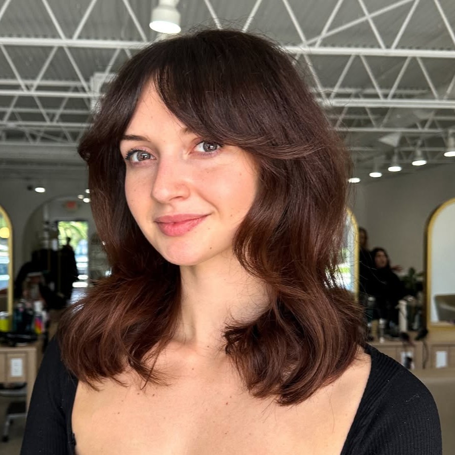 Piecey side bangs are fun to style, and when you get tired of them, they are so much easier to grow out. If you want to make your look more elegant, curl the ends of your locks for ’90s Rachel cut vibes.