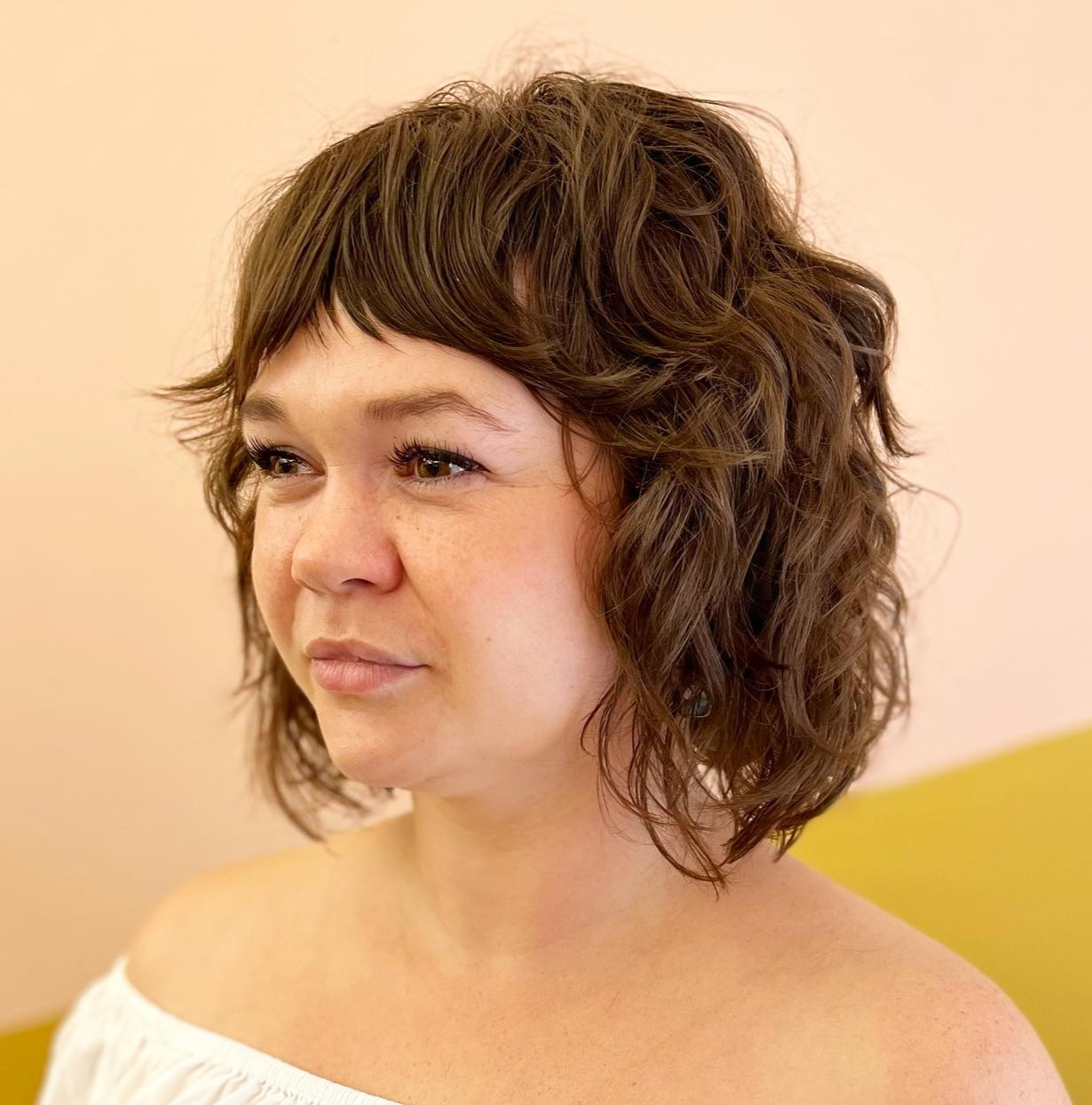 Curls work great with circular faces and cute curly bangs are a perfect addition. Complement this hairstyle with subtle highlights for extra interest points. This is one of the best styles for ladies with a fuller face and natural curls.