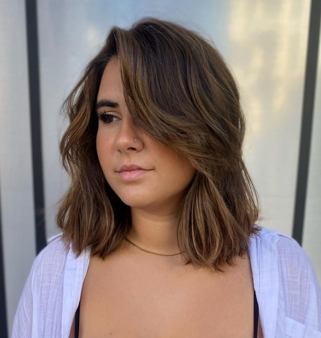 Medium loose curls deliver a slimming and face-framing effect for fuller cheekbones. For example, check out this cute hairdo. You’ll win with soft waves and feathered or sliced ends, and don’t forget to add honey highlights to draw more attention to your new mind-blowing style!