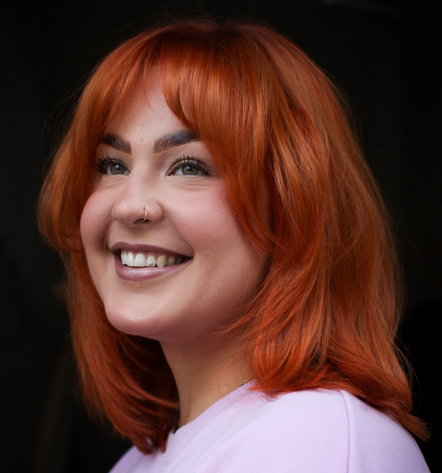 A medium-length cut with bangs is a flattering hairstyle for a round face shape. The layers elongate the face while feathered bangs emphasize your beautiful eyes. Use a curling iron to create a tousled wavy texture and add dimension to your gorgeous copper hue.