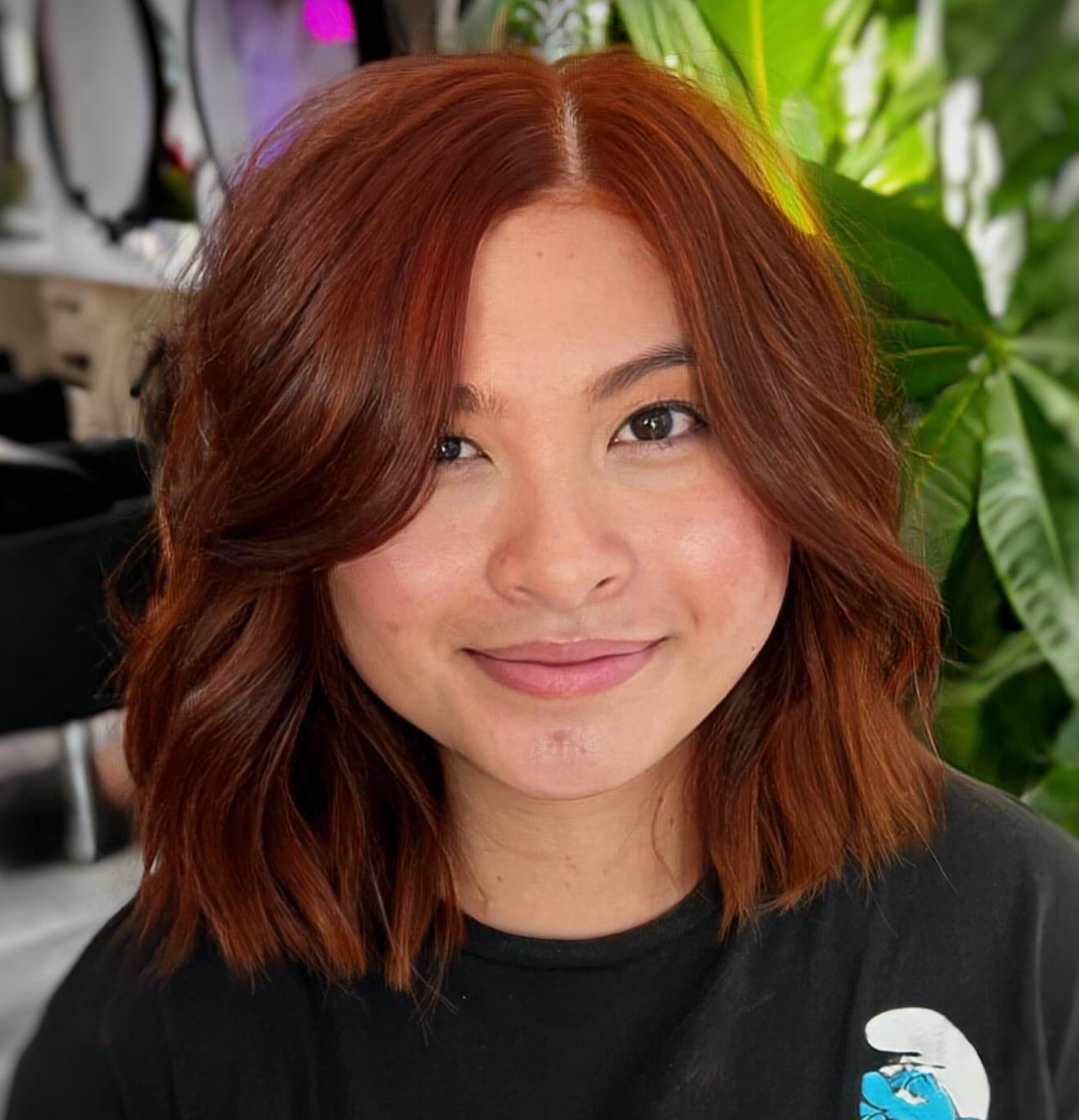 A medium-length cut with bangs is a flattering hairstyle for a round face shape. The layers elongate the face while feathered bangs emphasize your beautiful eyes. Use a curling iron to create a tousled wavy texture and add dimension to your gorgeous copper hue.