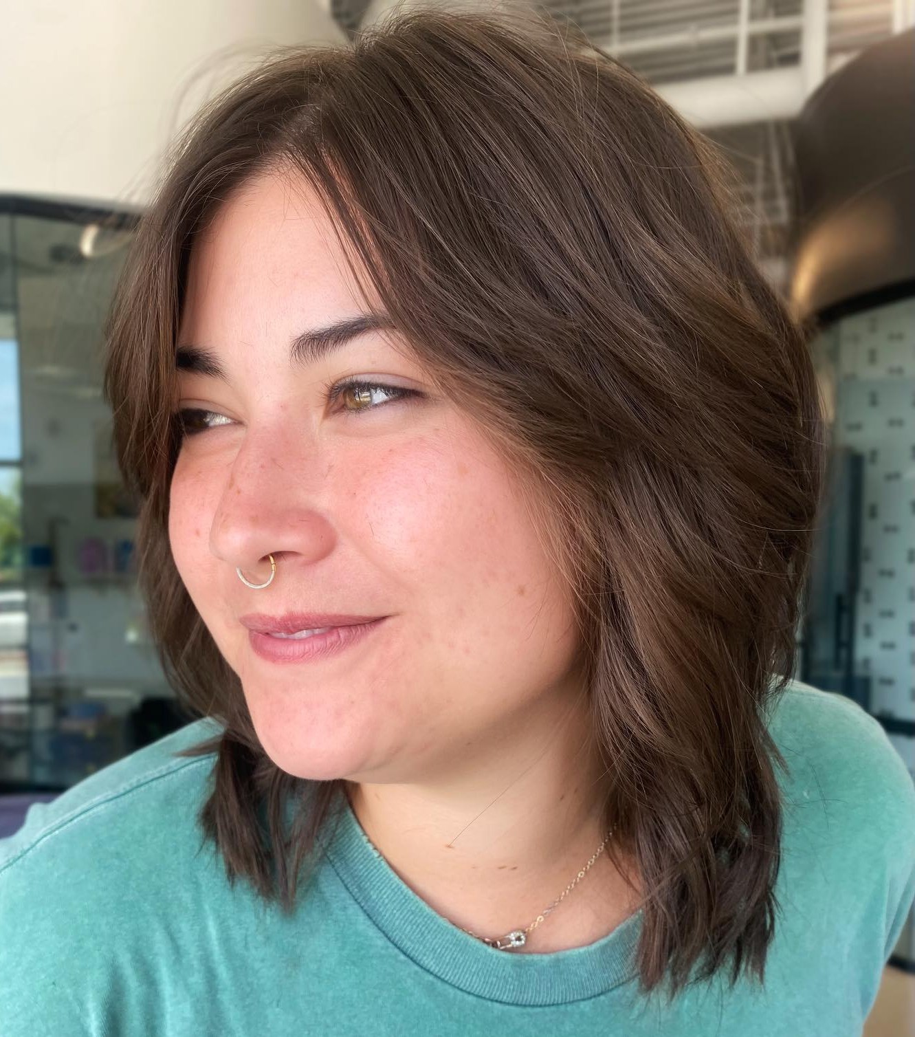 It is a common misconception to think that intricate styles work best for fuller faces. In reality, an easy one can sometimes be the better look. This shaggy style supports the theory. The layers and effortless texture are striking and flattering.