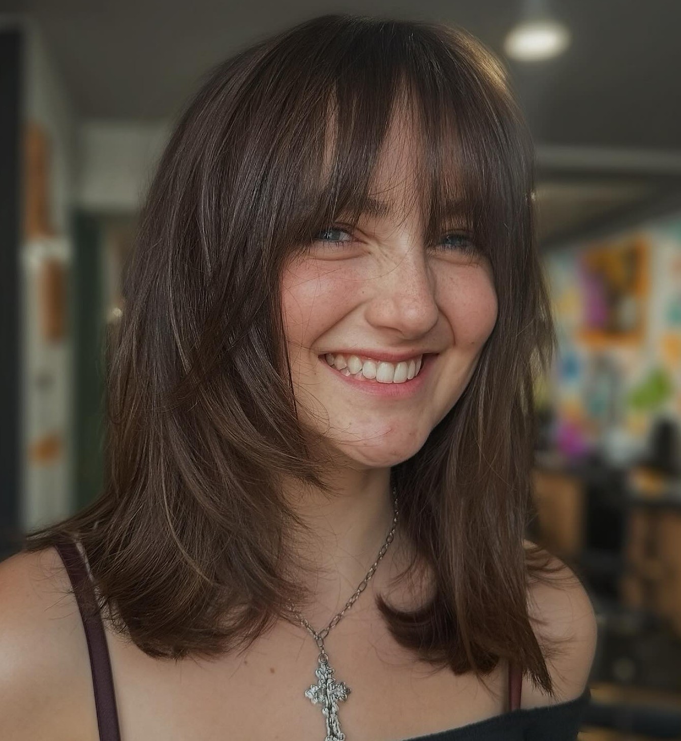 Medium hair can look more stylish and eye-catching than long hairstyles, and this cut is direct proof of that. To achieve this voluminous and textured look, you should ask your stylist to add wispy bangs and shorter layers. This will add playful and sassy vibes to your appearance.