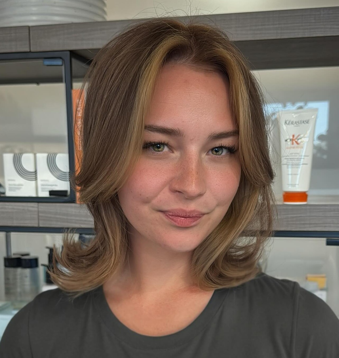Want to bring more elongation to your face? Book an appointment with a stylist to recreate this gorgeous layered cut that will emphasize your beautiful appearance. You may blow dry the layers away from your face and add babylights to bring more dimension and texture to your natural color.