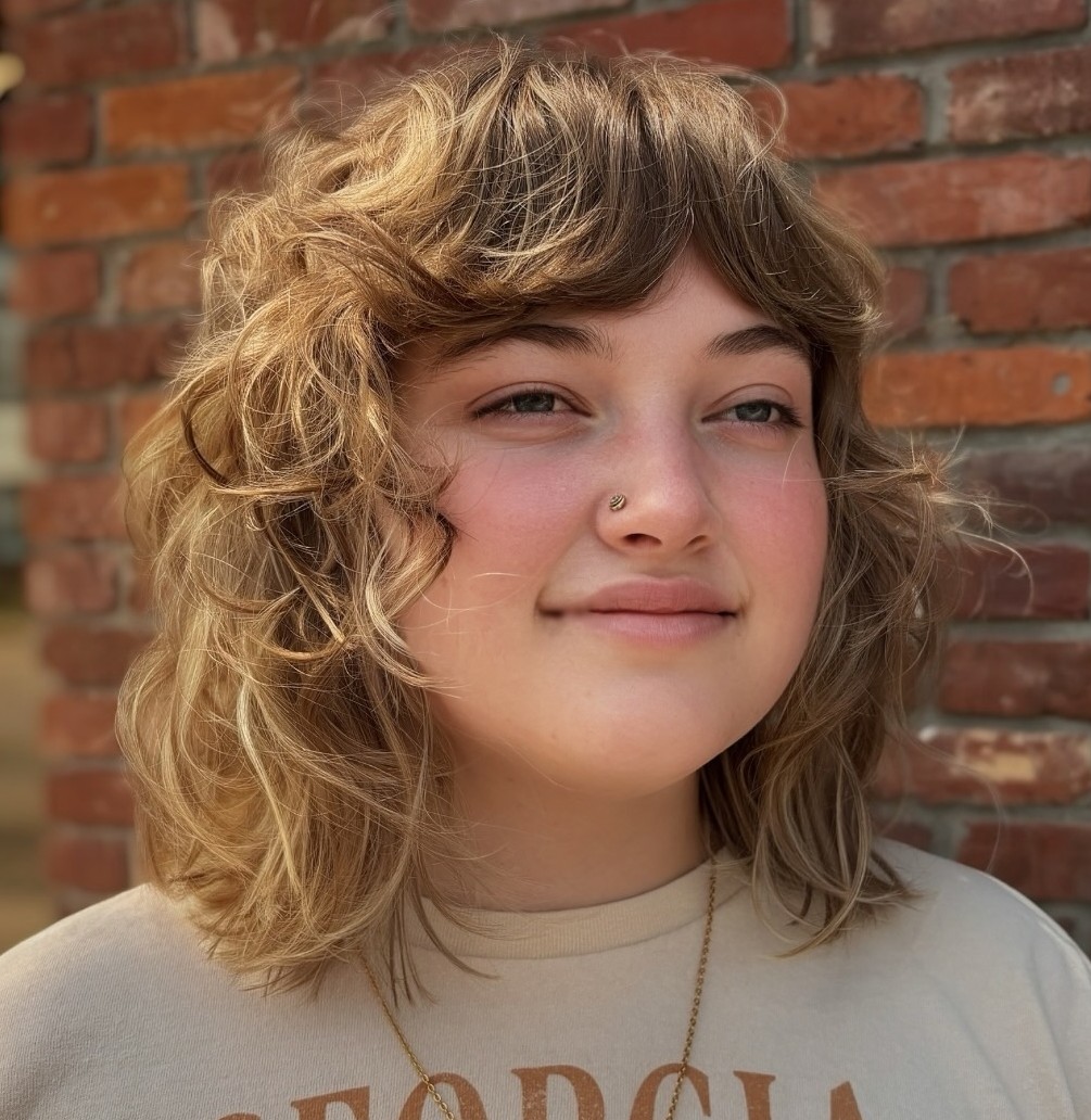 It is a common misconception to think that intricate styles work best for fuller faces. In reality, an easy one can sometimes be the better look. This shaggy style supports the theory. The layers and effortless texture are striking and flattering.