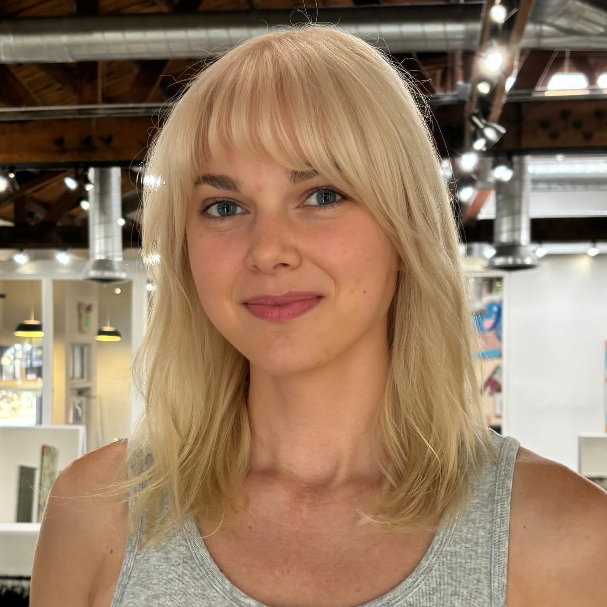 Mid-length cuts benefit from enhanced texture and layers that create an elongated silhouette and balance the appearance. If you like catchy blonde hairstyles, go for tousled layers or messy waves, as well as dramatic side-swept bangs.