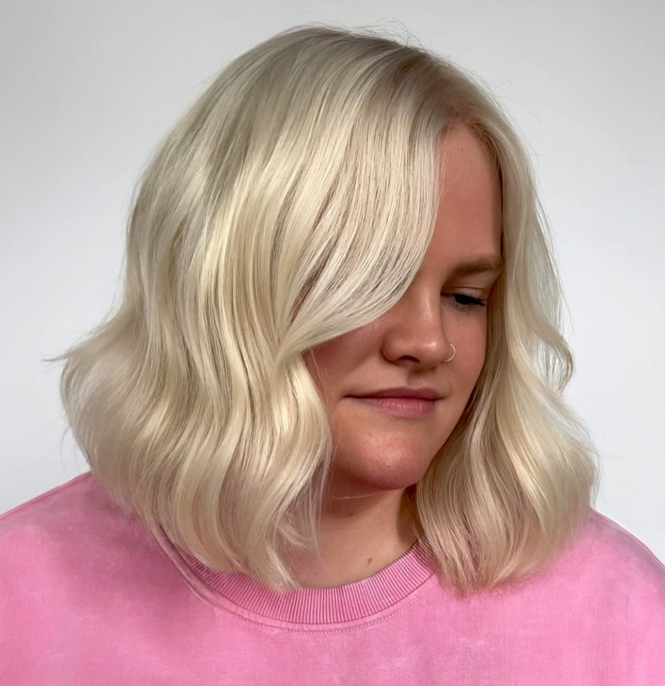 A classic bob works well for those with thin strands and a fuller face by framing the face in a flattering way but not overpowering it. A natural-looking platinum blonde tone, running down the entire length, along with a gentle thin fringe, makes this look softer and more feminine.
