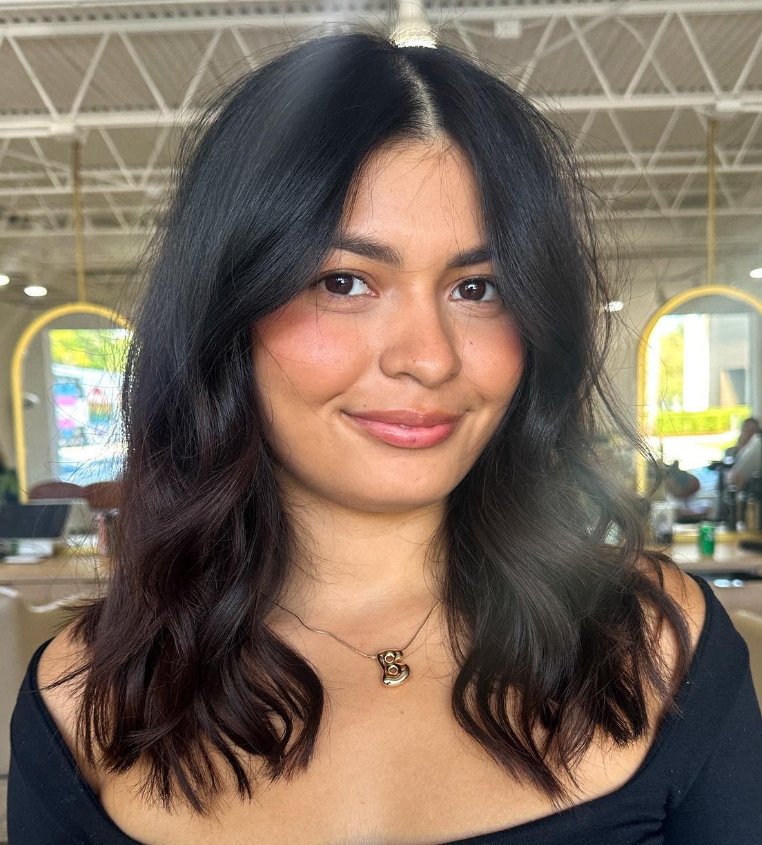 This wavy black haircut with curtain bangs works great for round-shaped faces. The chunky layers curl gently around the face drawing attention to the cheekbones and eyes and covering the fuller cheeks. It’s a symmetrical way of working with your hair’s mid-length if you want to elongate the face visually.