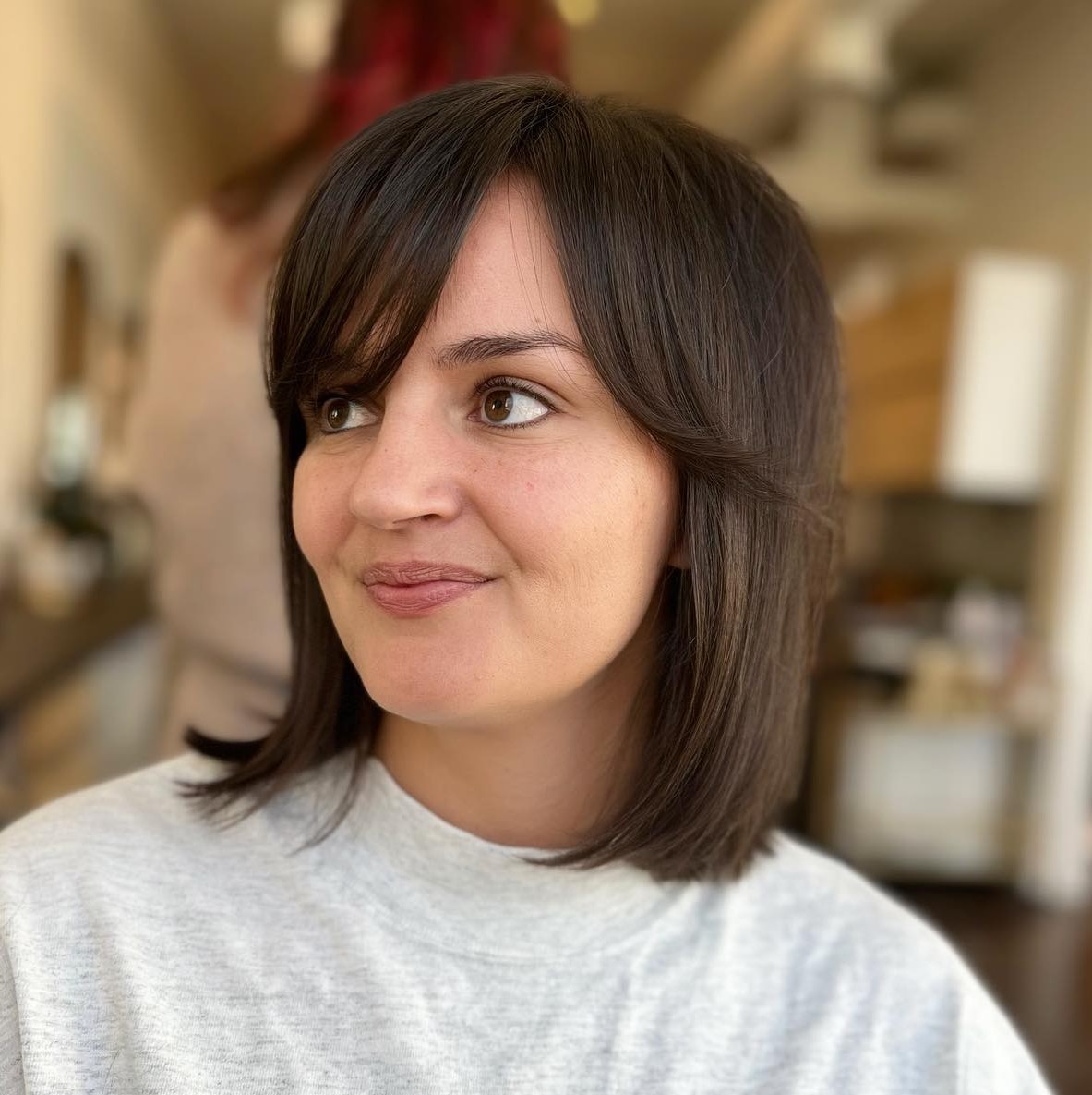 These are the right bangs for a round face. They cut the width of a broad face and draw attention to beautiful eyes. Choose a trendy hair color to upgrade your favorite flattering cut.