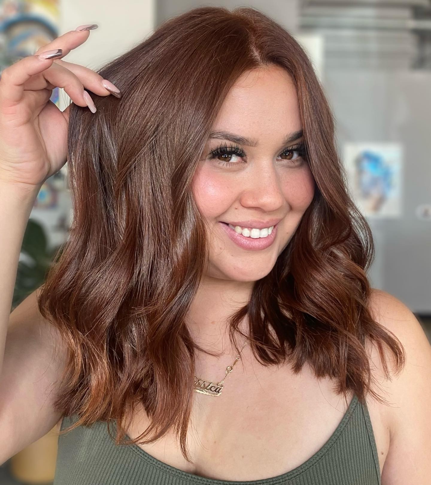 A disheveled lob is one of those classic medium styles that never fail. Loosely parted to the side and uneven in length, the tousled appearance of this dark-brown cut really works to flatter a fuller face. No chance of it being boring; just ask the rusty copper babylights!