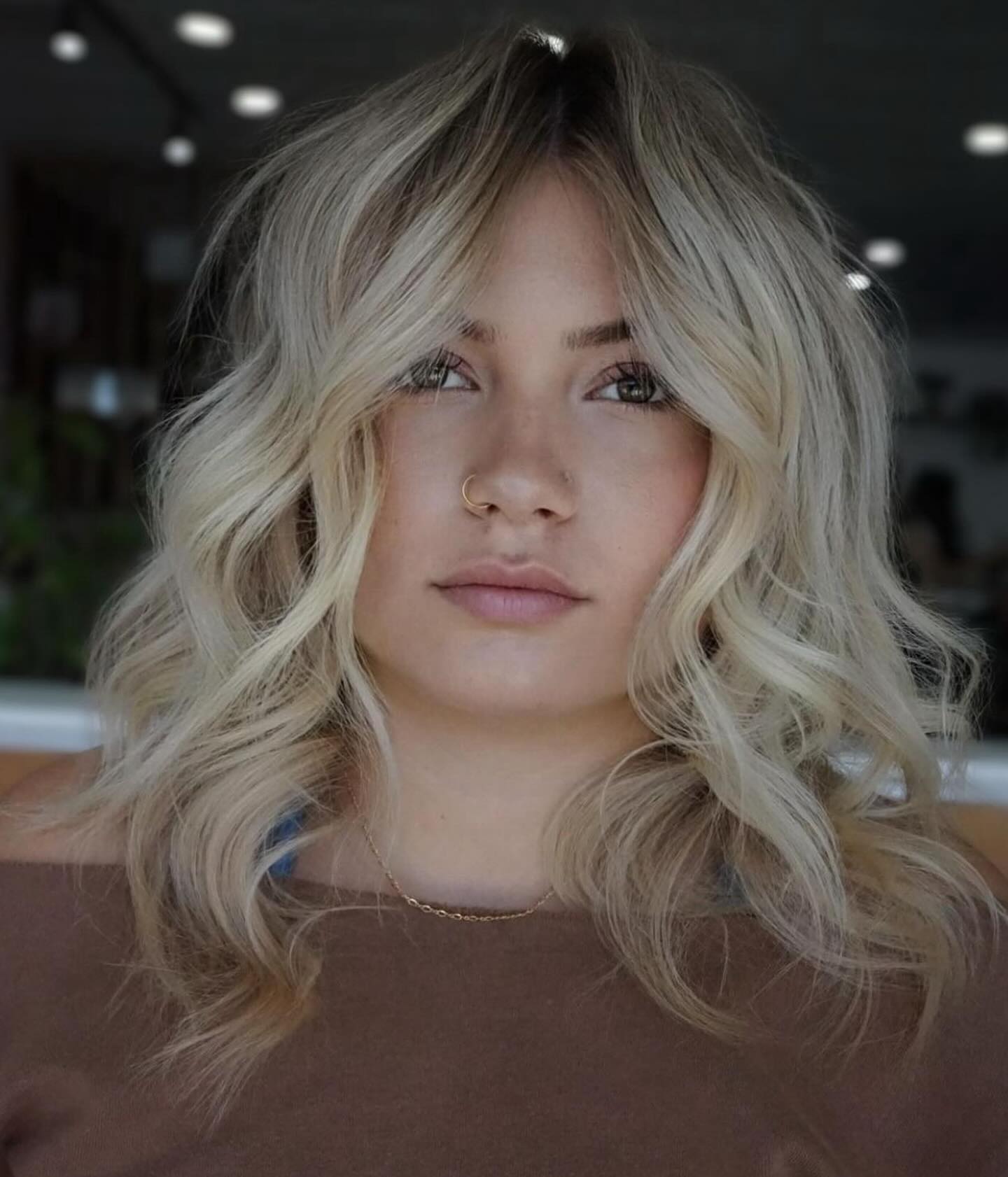 Mid-length cuts benefit from enhanced texture and layers that create an elongated silhouette and balance the appearance. If you like catchy blonde hairstyles, go for tousled layers or messy waves, as well as dramatic side-swept bangs.