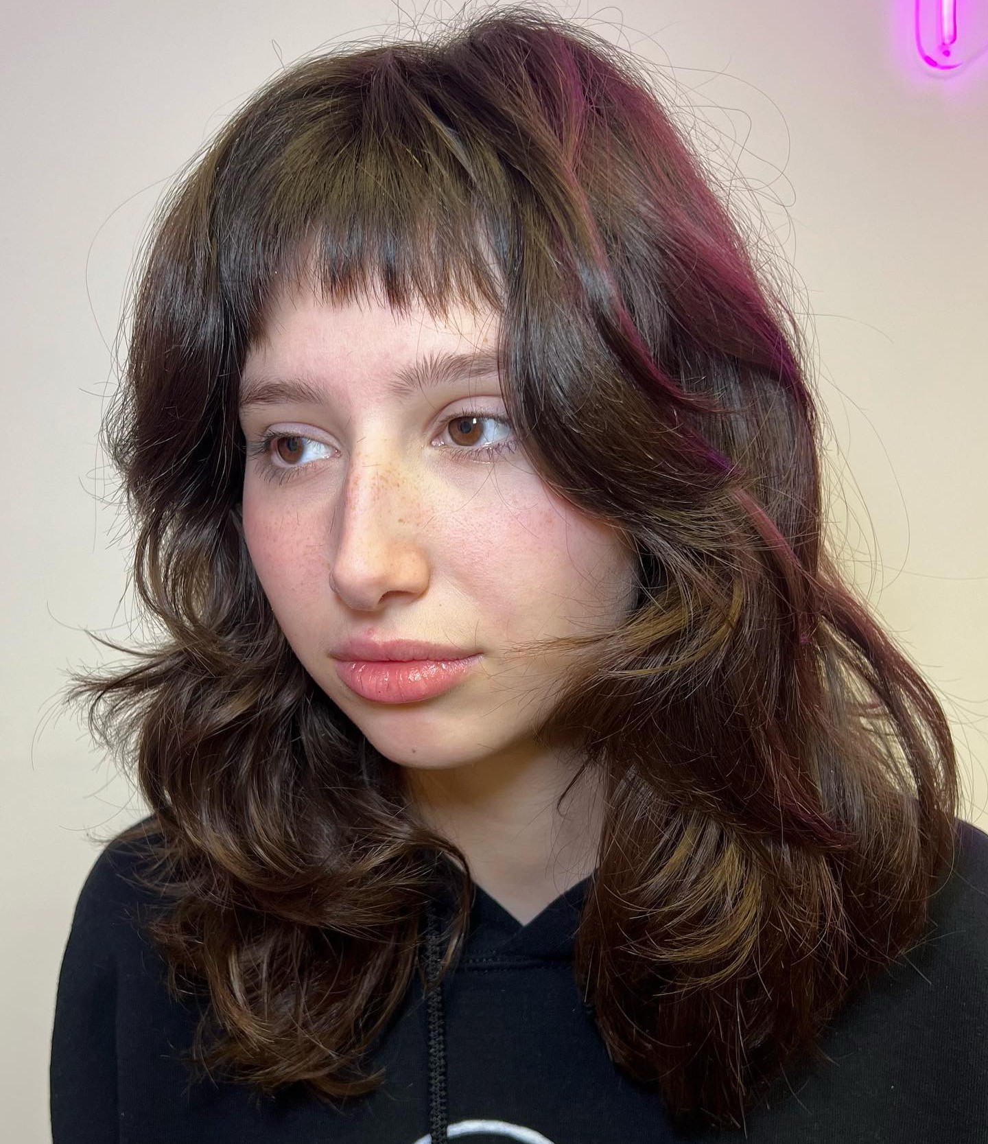 Medium hair can look more stylish and eye-catching than long hairstyles, and this cut is direct proof of that. To achieve this voluminous and textured look, you should ask your stylist to add wispy bangs and shorter layers. This will add playful and sassy vibes to your appearance.